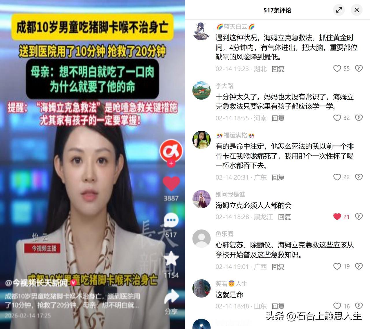 10岁男童一口猪脚丧命 成都10岁罗姓男孩,吃猪脚时卡喉,送医花了10分钟,最终抢救无效。 妈妈至今崩溃:“就一口肉,为什么就要了他的命?” 肉没那么致命,真正可怕的是卡喉后的缺氧速度,快到你根本反应不过来! 看看这个扎心的脑缺氧时间轴:0-15秒意识丧失,4分钟脑细胞开始不可逆损伤,超过10分钟基本脑死亡。 孩子当时还在玩平板,分心没嚼烂干硬的猪脚,大块异物直接堵死气道,这10分钟送医路上,早就把最后一丝生机耗没了! 有人说这是命?我偏说这是急救常识缺位酿的祸! 要是妈妈当时会海姆立克急救法,在黄金4分钟里把异物冲出来,悲剧说不定就不会发生! 现在谁家没让娃边吃边玩过?别把这种小疏忽当成无所谓! 海姆立克急救法真的是每家每户的刚需技能,学校该教,社区该推,所有人都得学! 这种因为无知毁了一个家的事,真的不能再重演了!