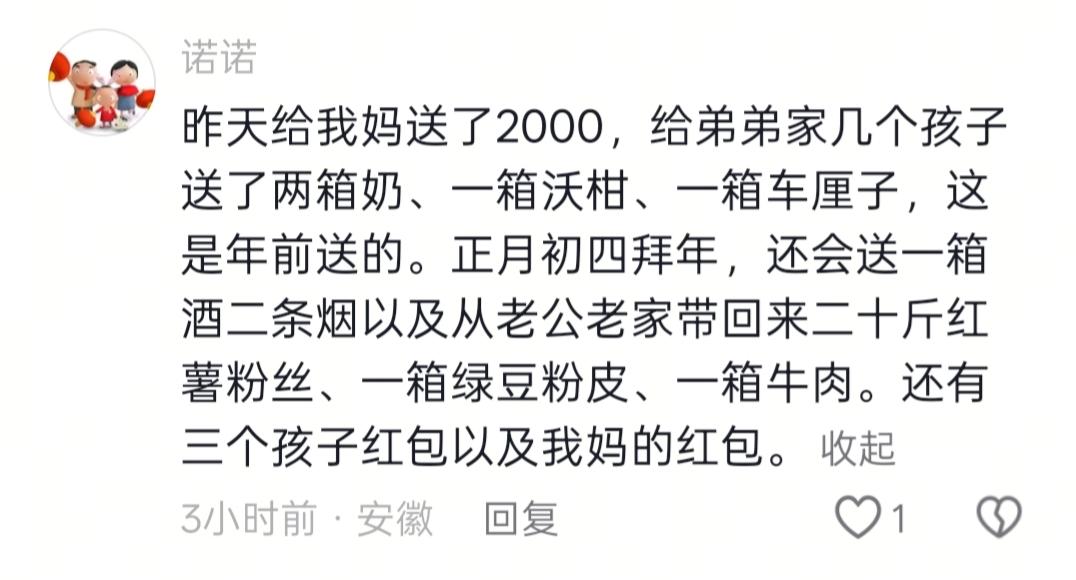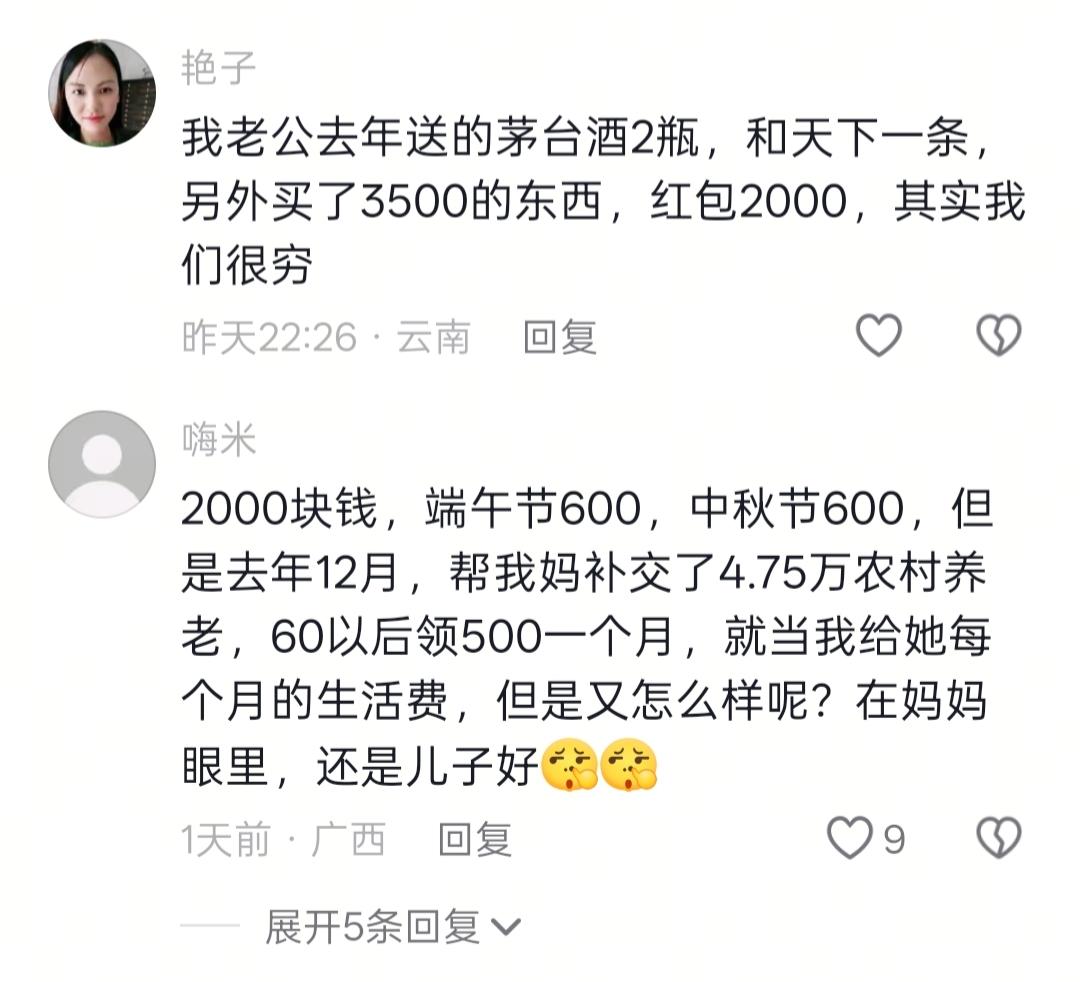 四箱牛奶,四条烟,一篮螃蟹,2500块钱,这算什么级别的新年礼节呢?这是一位丈母娘分享的女儿新年礼物! 再看看评论区,女儿们一个个不甘示弱,都把自己给娘家准备的物资发出来,我大概看了下,发出来的都大差不差,都是花销比较多的人家。 一些男士又有意见了,给婆家拿了没?拿了多少? 现实生活中的答案是,养儿子的家庭一点都不会亏。看家庭条件,条件好的,不差这么一点,他们觉得儿子的就是自己的。孙子还有的赚。那条件不好的家庭,年货都是儿子儿媳妇备,那费用物质一点不比女儿给娘家的少。 根据自己家庭条件来决定就好,每个人本来出身不同,受到的教育不同,得到的资助不同,能力不同,有孝心就行了,攀比没有尽头!