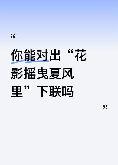 下联:蝉声悠扬月色中 简单赏析 - 上联写视觉:夏天的花影在风里轻轻晃动,很温柔。 - 下联配听觉:蝉鸣伴着月光,安静又舒服。 - 上下一静一动、一影一声,画面感超足,读起来也顺口,很有夏日氛围感。