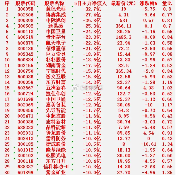 蓝色光标:5日净流出 32.7亿元,量比 0.80协鑫集成:5日净流出 27.4亿元,量比 0.77中际旭创:5日净流出 26.8亿元,量比 0.81新易盛:5日净流出 25.3亿元,量比 0.70中国卫星:5日净流出 24.3亿元,量比 0.65贵州茅台:5日净流出 23.3亿元,量比 0.84航天电子:5日净流出 22.2亿元,量比 0.58信维通信:5日净流出 21.3亿元,量比 0.65巨力索具:5日净流出 18.9亿元,量比 0.08杉杉股份:5日净流出 18.6亿元,量比 0.67
