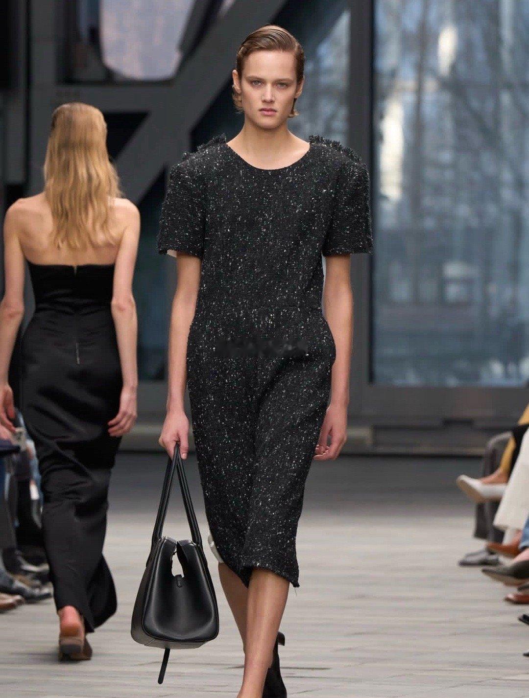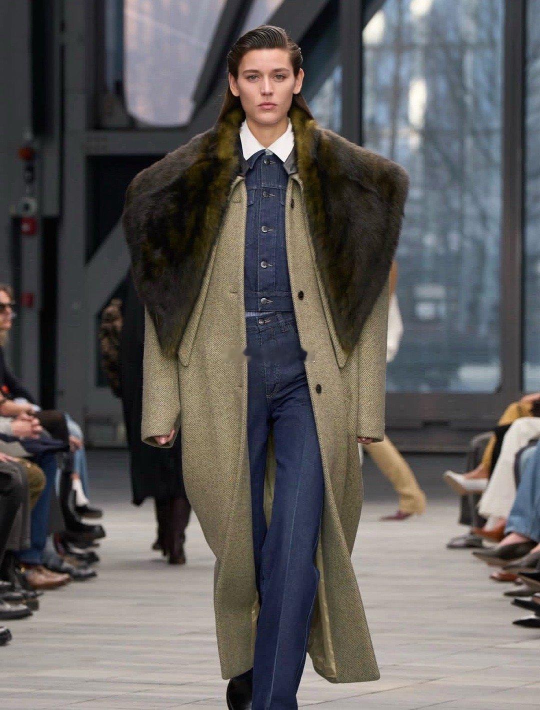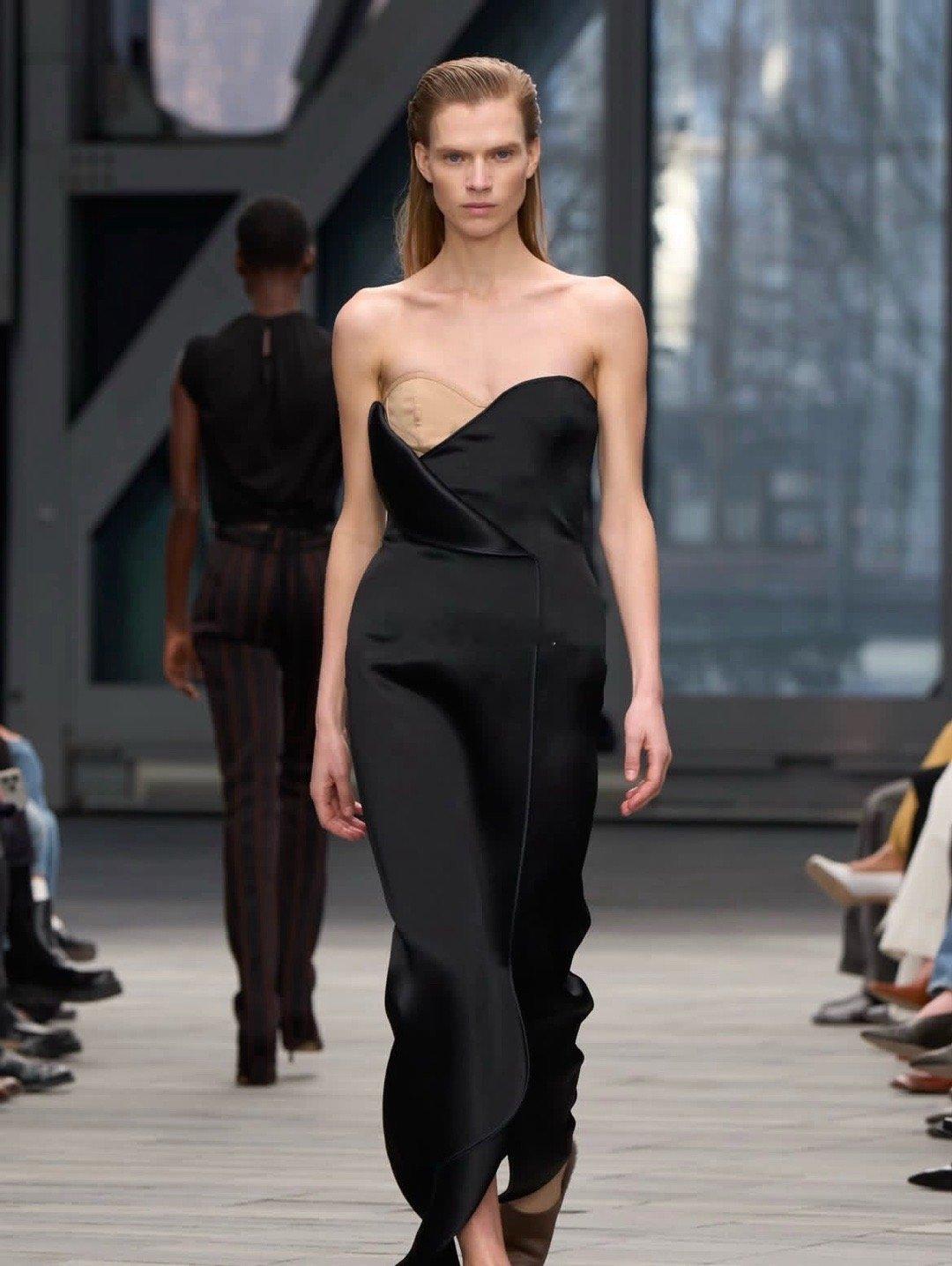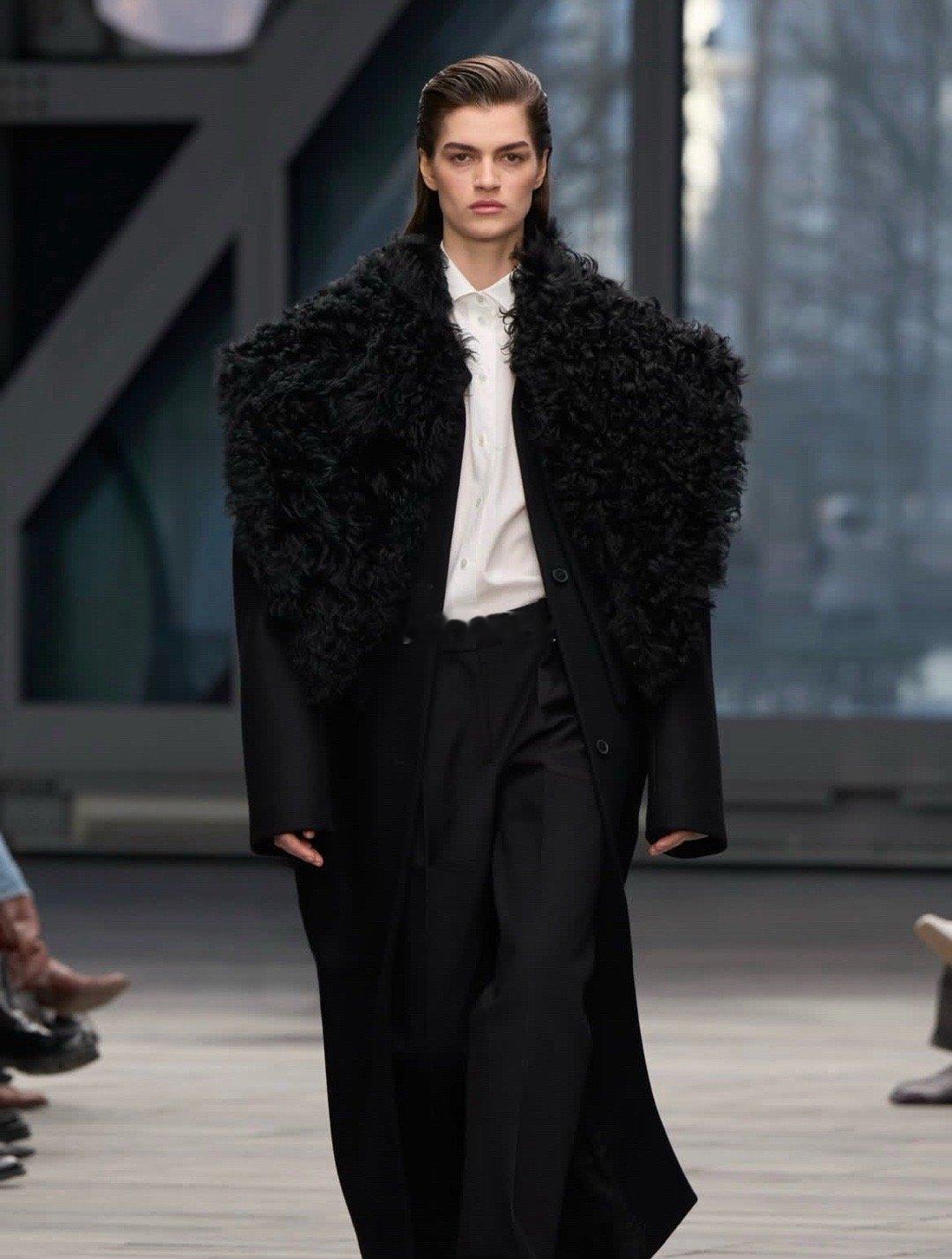 透视秋裤叠搭、镂空衬衫若隐若现,鱼骨胸衣从曳地长裙中探出,流苏围裙裙摆摇曳生姿,搭配东-西向手袋与硬朗配饰,“着装从不是遮掩,而是身体力的延伸”。