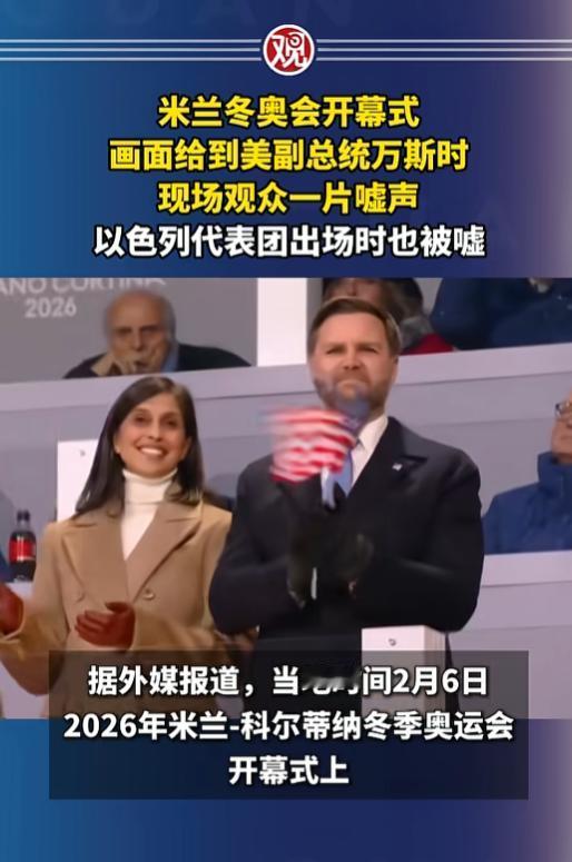 这下美以的脸彻底挂不住了,米兰冬奥会开幕式本该是一场热热闹闹的冰雪盛宴,可现场观众的几声响亮嘘声,直接把“体育无国界”的场面话撕得明明白白。 镜头刚切到美国副总统万斯和他妻子,俩人正笑着挥舞美国国旗,现场突然炸起一片嘘声和口哨声,连解说都忍不住感叹“这嘘声真不小”。 这可不是观众没事找事,开幕式前意大利人就因为美国ICE执法部门的暴力枪击案闹翻天了,加上美国还想派ICE人员来冬奥安保. 甚至米兰市长直接骂这是“杀人的民兵组织”,街头全是“万斯滚出去”的标语,开幕式上的嘘声,就是攒了好久的不满,直接在全世界面前喊了出来。 紧接着以色列代表团入场,又被部分观众嘘了,这和其他代表团出场时全场热烈鼓掌的画面,形成了扎心对比。 现在意大利街头早就满是声援巴勒斯坦的抗议,民众对以色列在加沙军事行动的不满,顺着冬奥赛场的通道,直接变成了现场的嘘声。 有意思的是,在另一个举办地科尔蒂纳,美国队和以色列队都得到了掌声,同一个冬奥,两种完全不同的待遇,把不同人群的态度摆得明明白白。 虽然奥运会本来想当“政治绝缘体”,但这次的嘘声偏偏证明,体育从来躲不开现实,观众没讲大道理,就用最直接的嘘声,表达对强权和不公的不满。 这几声嘘声,不是针对运动员,而是对个别国家政策的“现场投票”,也给奥林匹克精神提了个醒,体育可以超越国界但永远超越不了人心。 这些嘘声过后,没人会忘记这场开幕式,它告诉我们,当体育和现实撞在一起,最朴素的民意,才是最响亮的声音。