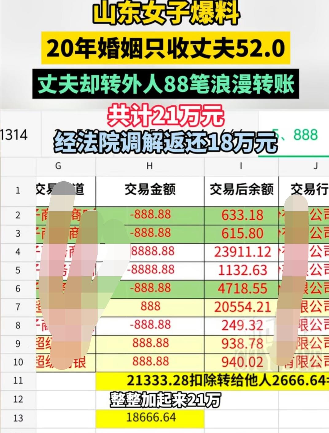 爷们,请自重自爱一点好不好?近日,视频中这个女子爆料,20年的婚姻却只收到老公52元,经过核实才知道,男子将钱几乎转给了同一个女子,而且分88笔累计21万,后法Y调解,男子返还女子18万。 就在2020年,男子多次提出离H,甚至起诉离H,刚开始女子没有同意,毕竟这也不是什么光荣的事。直到后来,女子愈发觉得不对劲,毕竟几年来男子几乎没转钱给她,那他挣的钱到底去哪了? 直到女子答应离婚,并且启动了相应的检查才发现,几年内男子多次给同一个女子转钱,而且转钱的金额具有特殊含义,比如“520、1314”等。对此,女子只能维护权益,最终获得18万赔偿。 该视频爆出,网友们几乎瞠目结舌,有人说:可怜这个女子,遇到了一个负心汉,好在女子拿起了法律的武器来维护自己,希望女子好好生活,想必一定会遇到一个疼她爱他的人,对于这个男人,只想说:爷们,请自重自爱一点好不好? 有人说:前世千年的回眸,才换来今生的相遇,既然两人走到了一块,好好过日子不香吗?男子何必要这样?我不支持夫妻离h,可男子婚内出g,辜负了他的妻子,这样的男子留他干嘛。 对此,各位老铁们,这事你咋看?