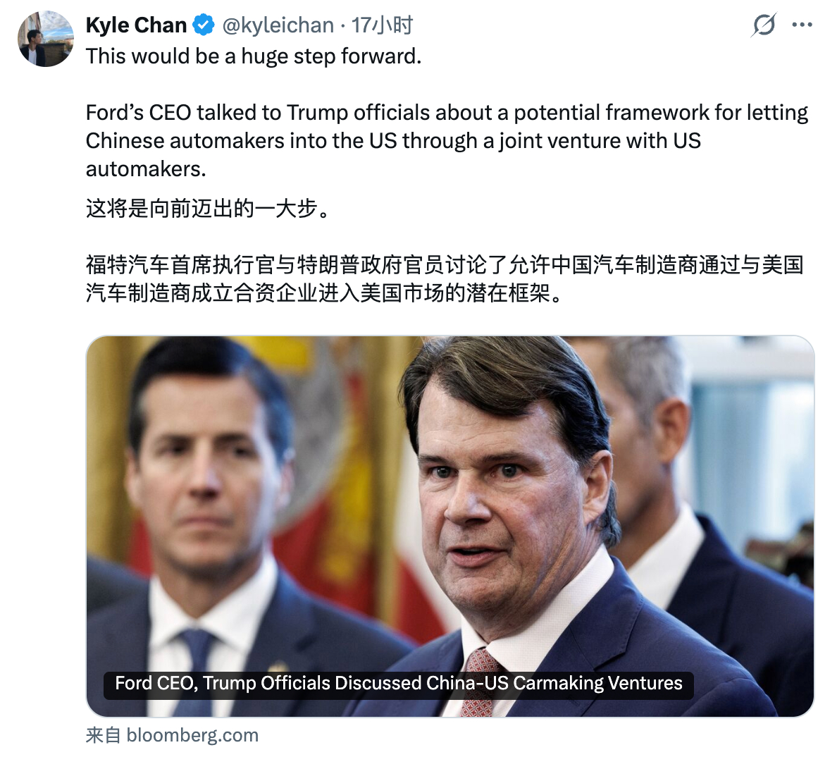 彭博社报道:福特 CEO Jim Farley 在 2026 年 1 月的底特律车展上和 Trump 内阁成员,包括贸易代表、交通部长和环保署署长进行了非正式会议。