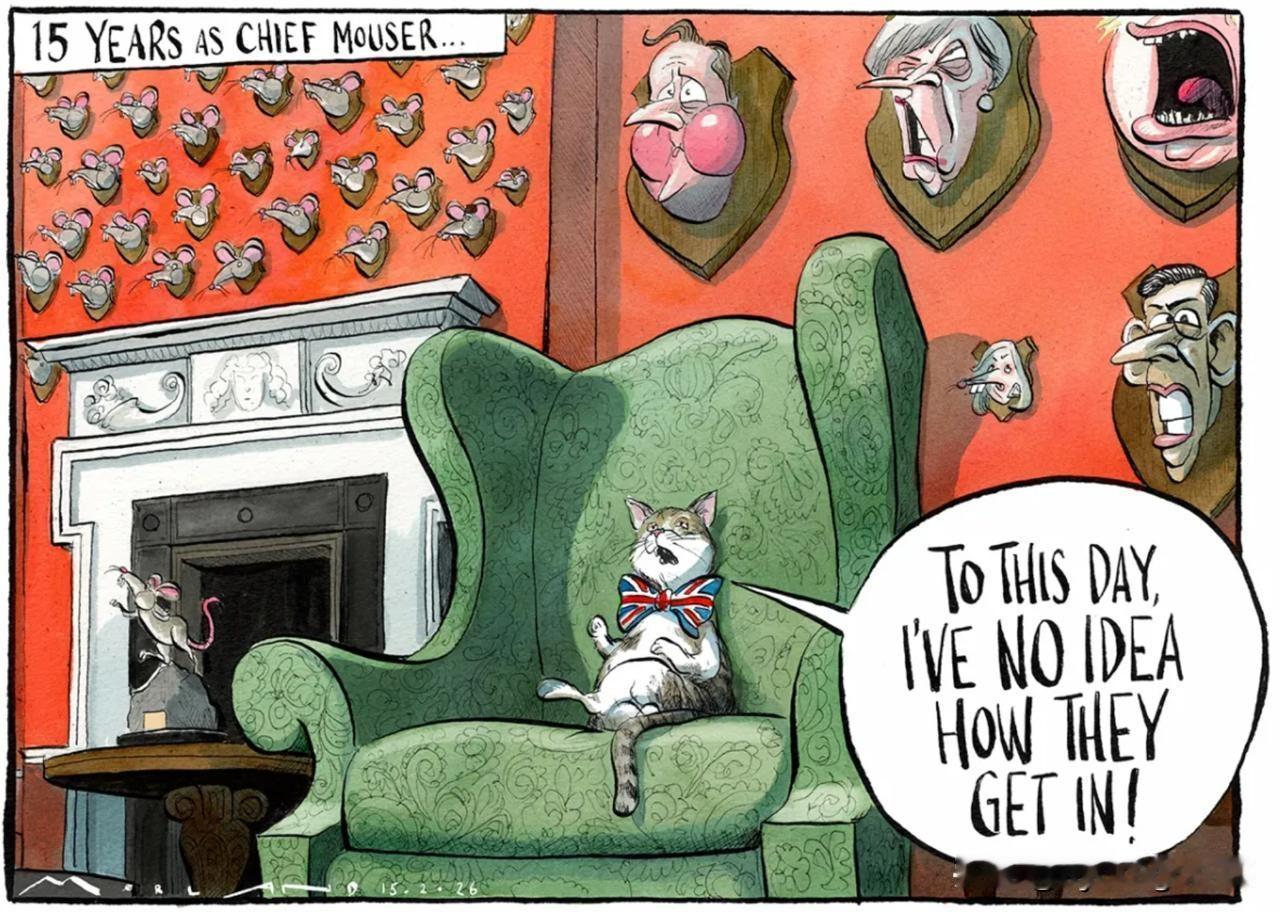🇬🇧明天将是英国首相唐宁街10号官邸首席捕鼠官拉里猫上任整整15周年的日子。 《星期日泰晤士报》今天指出,墙上的这只猫不仅挂着老鼠的头颅作为战利品,还挂着历任首相的头颅。正如你所见,斯塔默已经是它挂的第六位首相了,看来拉里很快就会把斯塔默也挂起来(漫画里对丽莎·特拉斯的刻画特别有趣)。 画中这只猫正惊讶地问道:“我还是不明白它们是怎么进来的!” 哎呀,可怜的拉里,鉴于这些首相的素质,全世界的人都在纳闷,这样的人怎么能当上重要职位的呢!