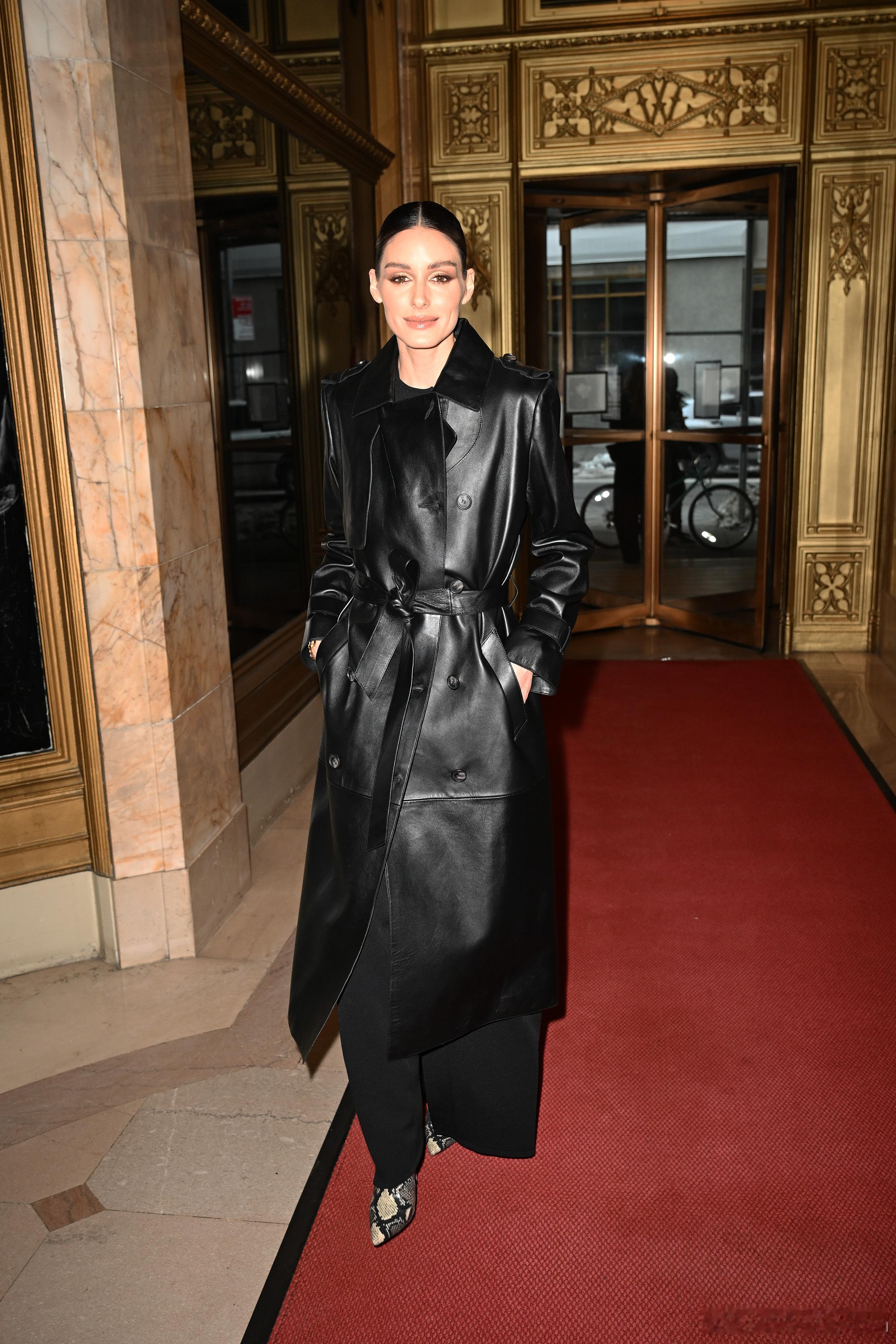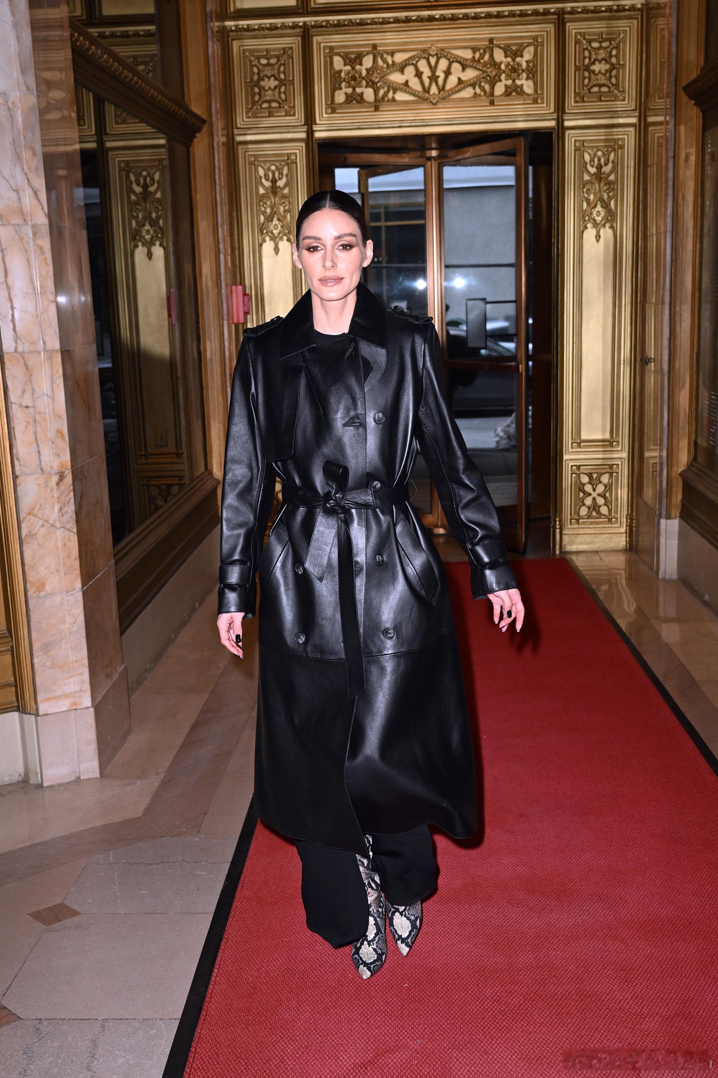 Olivia Palermo奥利维亚巴勒莫在纽约时装周期间,身着一套长款的黑色皮肤夹克,搭配尖头蛇皮纹高跟靴前往观看Altuzarra品牌的大秀