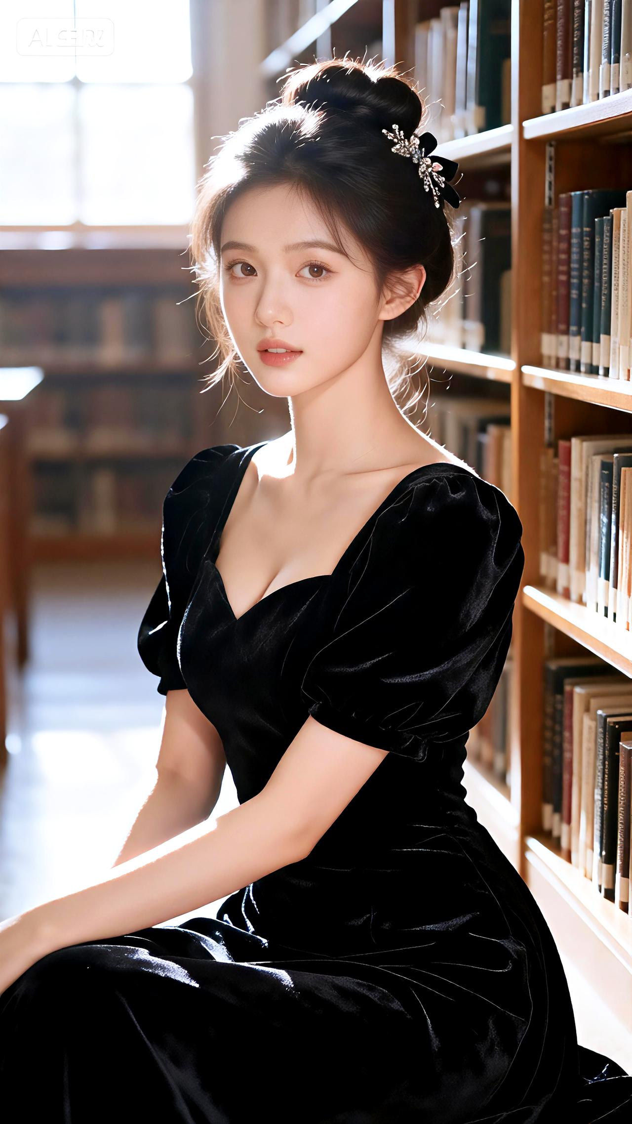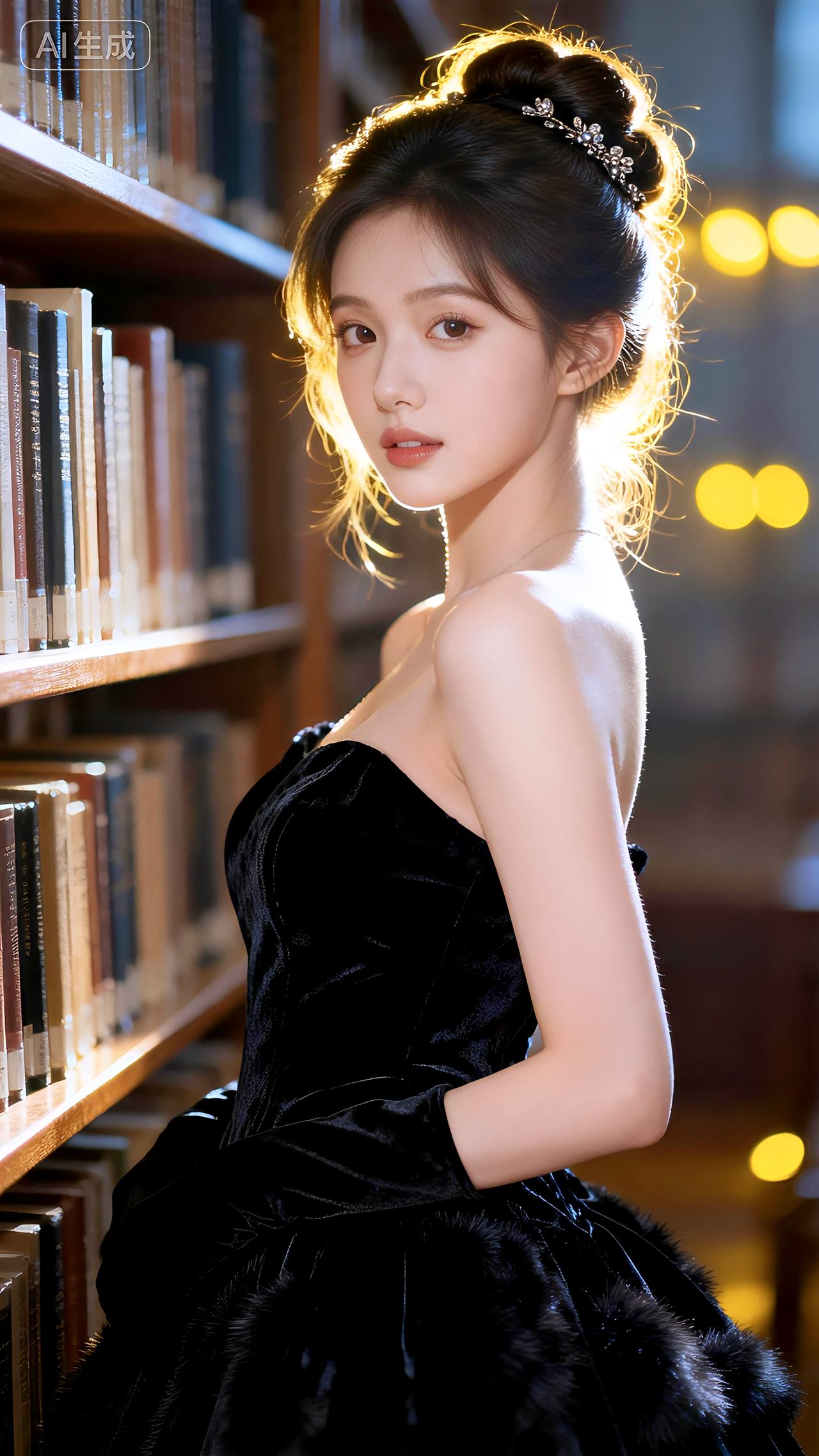 新年爱好打卡昏黄灯光下的图书馆,她身着黑色丝绒礼服,盘发优雅,气质静谧如诗。豆包 壁纸 写真