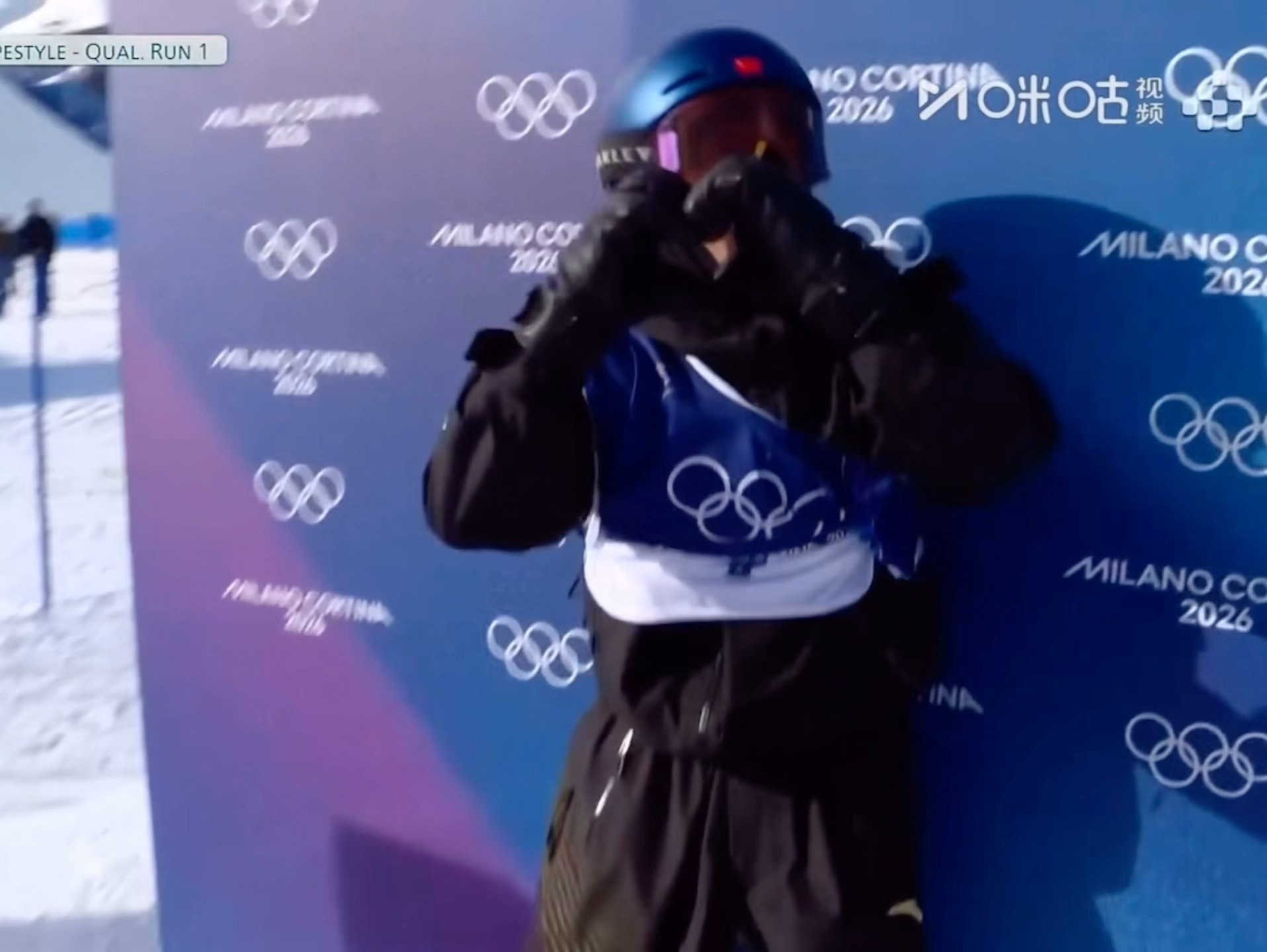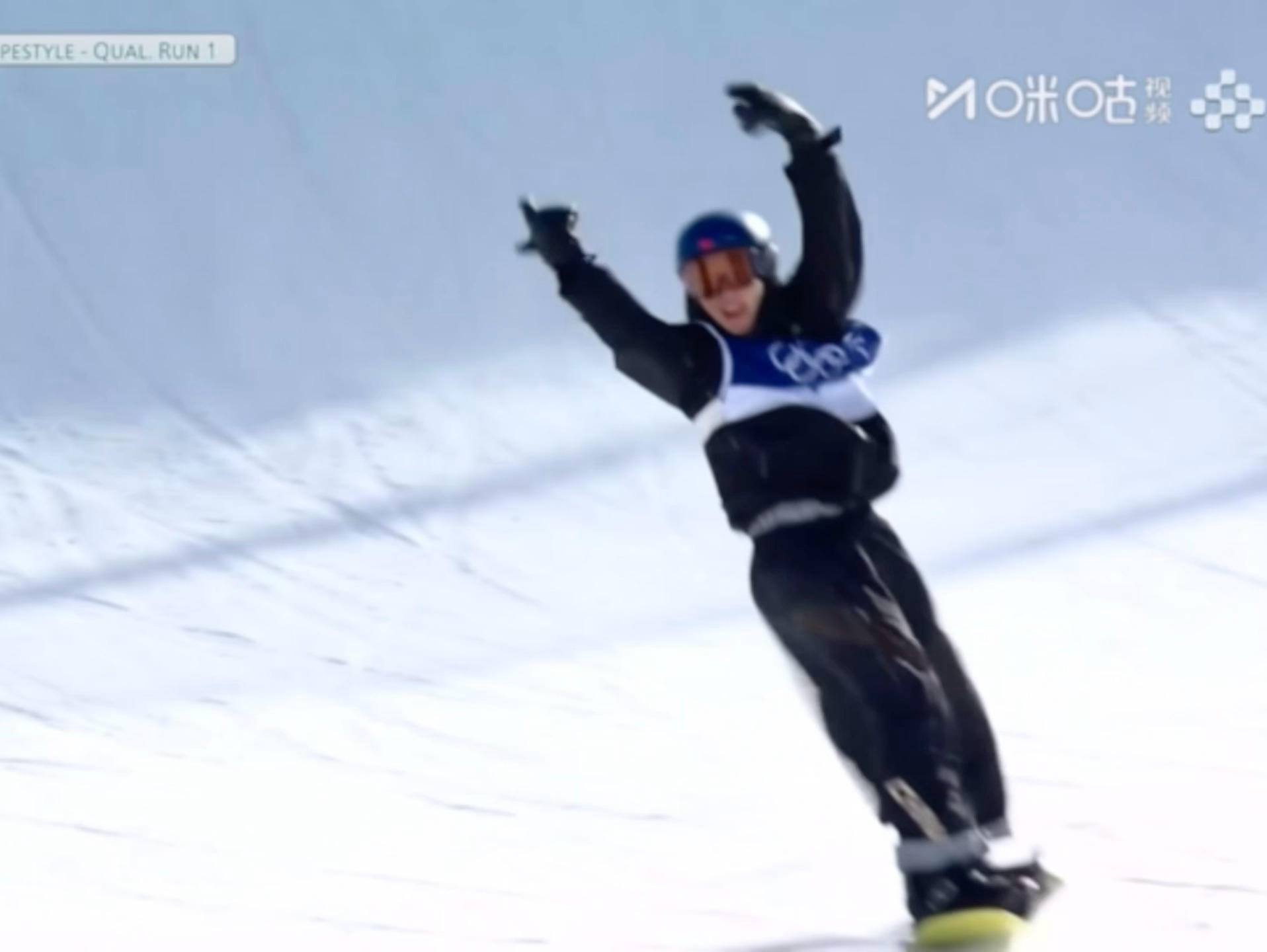 刚刚完成第一滑,动作干净利落。苏翊鸣完成动作后举起双臂欢呼,并对镜头比心,状态太好了!