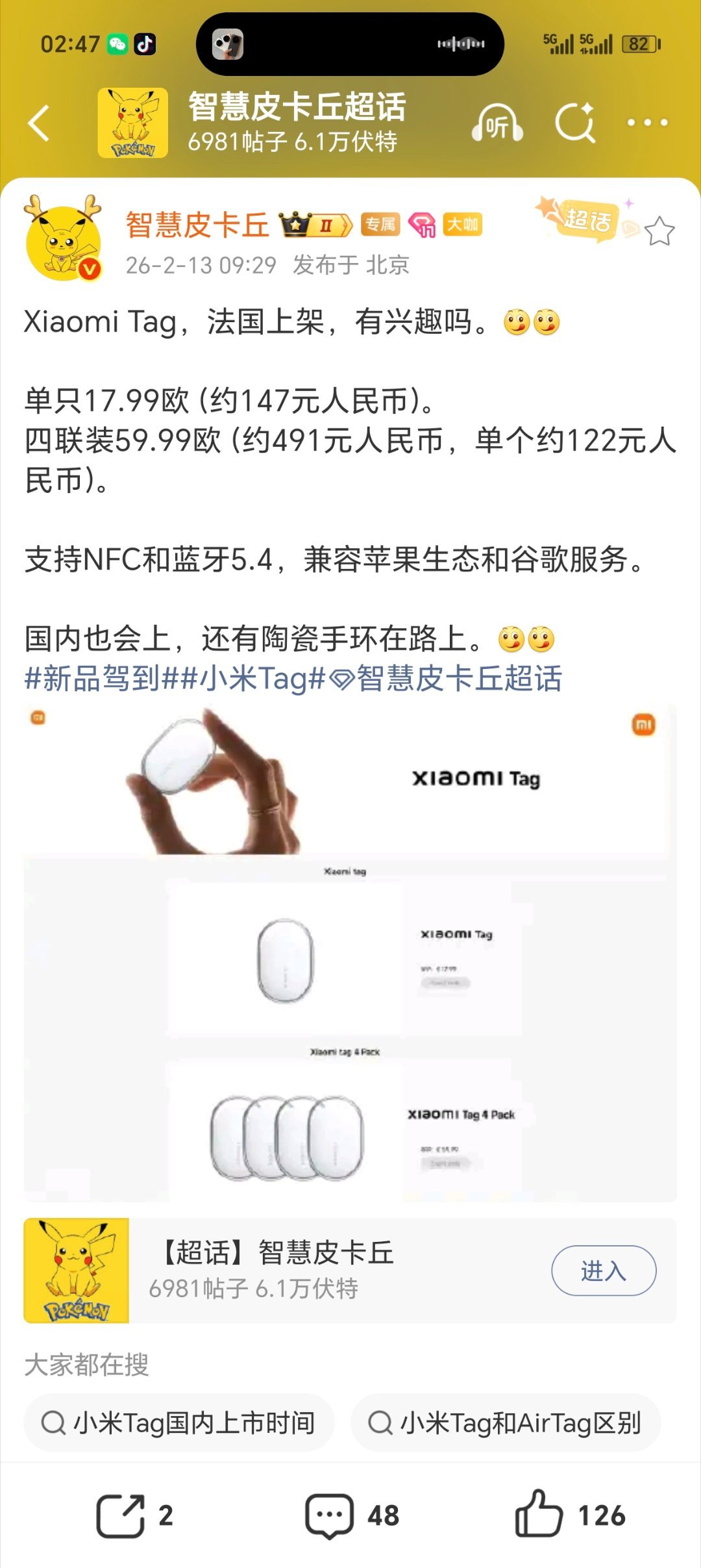 博主 智慧皮卡丘 发文,透露小米昨天在欧洲市场推出的 Xiaomi Tag 追踪器也将推出国行版本,还有“陶瓷手环在路上”。