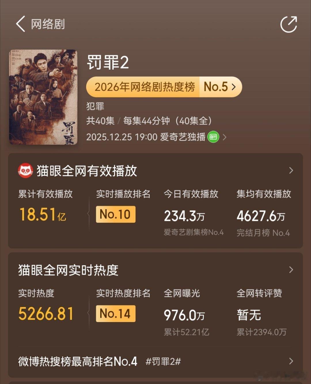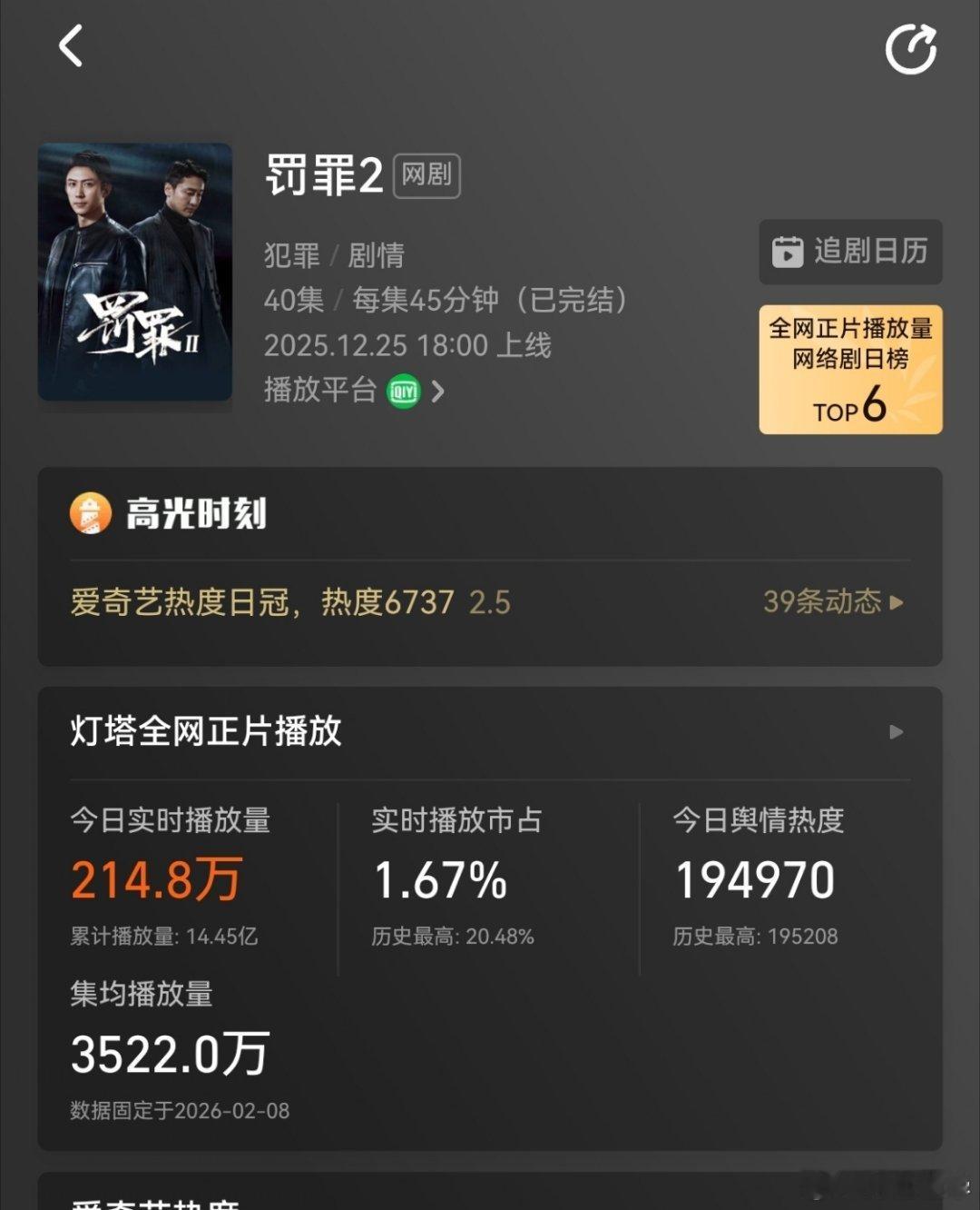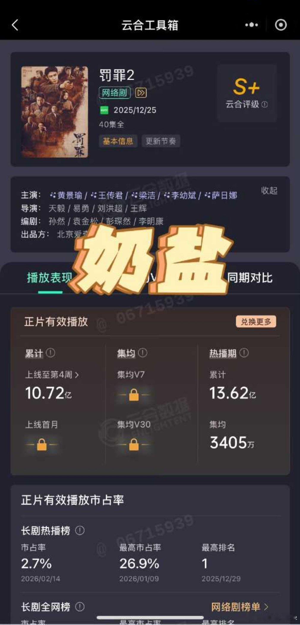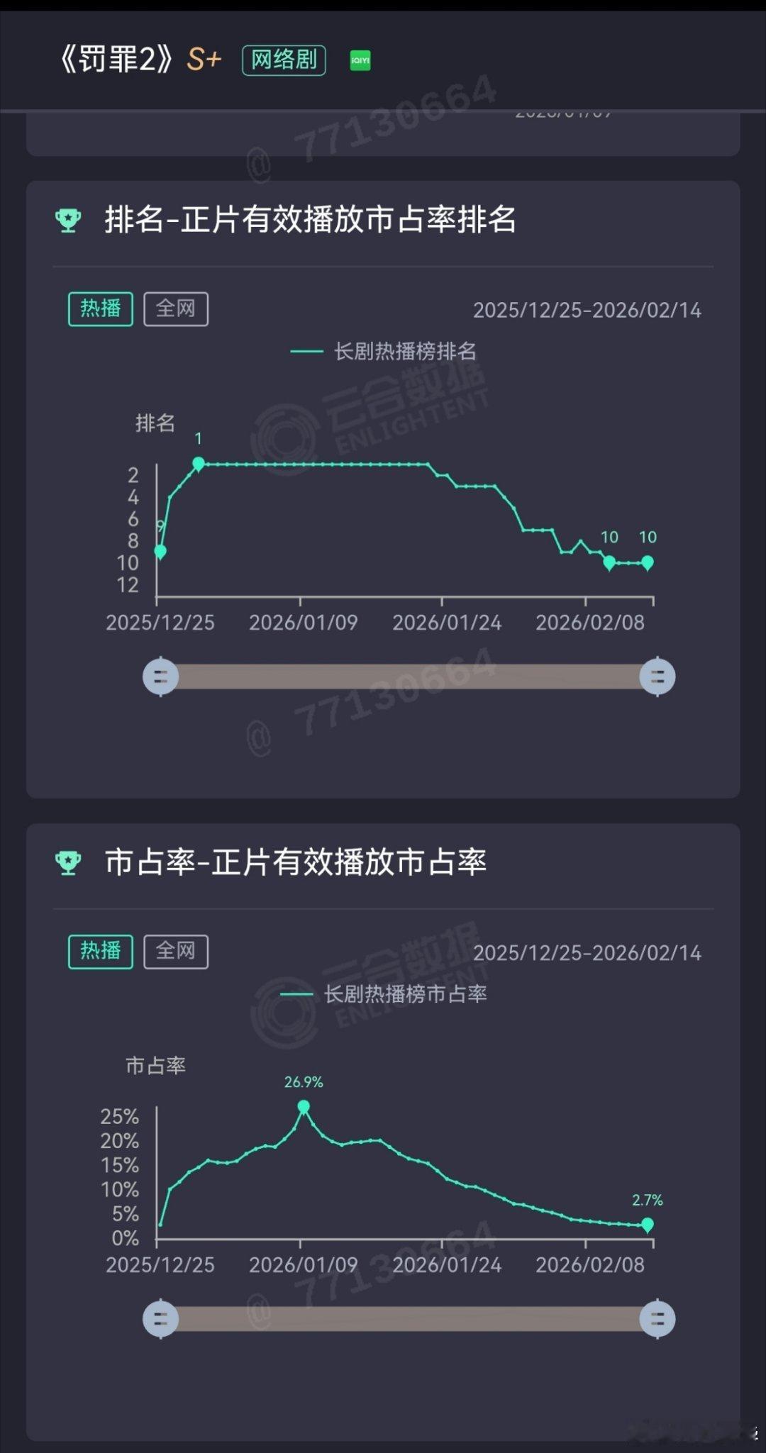 2月14日,罚罪2VIP更新结束第30天,今天排第10!!!!今天云合热播期结束(酷云还没结束)。从第一天第9名到最后一天10名,全热播期(2025年12月25日—2026年2月14日)52天都在10名以内!!连续25天云合日冠(2025年12月29日—2026年1月22日),黄景瑜秦枫 连续30天霸屏角色日冠(2025年12月27日—2016年1月25日),集均3405万,今年目前唯一破3000万达3400万以上作品!!!罚罪,云合第28。黄景瑜罚罪2接下来向你走来的是仿佛为黄景瑜写的三线厂子弟张小满,电视剧岁月有情时定档黄景瑜张小满 2月20日上线。有些人要开除云合,灯塔热播期到2月8日,集均3522万,猫眼播放量18.51亿,集均4628万,无所谓啦~~云合估最低~~