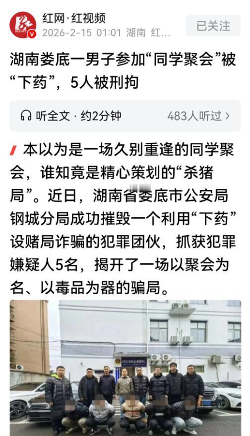幸亏多了个心眼!2月15日报道,湖南娄底,一男子接到老同学电话,邀请他聚餐叙旧。男子重情义,欣然前去。令人奇怪的是,除了一个老同学之外,其他都是陌生人,期间几个人轮番劝酒,男子很快醉酒,但他感到状态又不似醉酒,立即想办法脱身,并报警。调查结果,令男子后背发凉…… 都说老同学见面那是两眼泪汪汪,可对于湖南娄底的张先生来说,这老同学见一面,差点让他把身家性命都搭进去。 本来以为是一场回忆青春的温情饭局,结果硬生生变成了步步惊心的“鸿门宴”,这事现在想起来,张先生还是觉得后脊梁骨一阵阵发凉。 2025年11月那天,家住娄底的张先生手机响了,一看号码,哟这不是多年没见的老同学林某嘛。 电话一接通,那头的林某热情得不得了,说自己专门从外地过来,没别的事,就是想找老同学聚聚,吃顿饭,联络联络感情。 张先生这人也是个实诚君子,重情重义,一听老同学大老远来了,哪有不去的道理?那是二话没说,直接答应了。 等到了约好的饭店包厢,张先生推门一看,心里就稍微“咯噔”了一下,为啥呢?因为包厢里不光坐着老同学林某,还有四个大老爷们,个个面生得很。 林某倒是轻描淡写,随口介绍说这都是他的“朋友”,至于具体是干啥的、叫啥名,一概不提。 张先生当时虽然觉得有点不对劲,但想着既然来了,总不能驳了老同学的面子,也就硬着头皮坐下了。 这屁股刚挨着椅子,饭局的节奏就不对了,这哪是叙旧啊,简直就是灌酒大会,那几个陌生男子轮番上阵,嘴里全是客套话,手里酒瓶子就没停过,一杯接一杯地给张先生满上。 老同学林某也没闲着,在边上一个劲地劝,说啥“难得见一面,不喝到位就是看不起我”,俗话说双拳难敌四手,何况这一桌子人围攻一个?张先生推脱不过,只能一杯接一杯地往下灌。 没过多久,张先生就感觉不对劲了,按理说自己酒量也还行,平时喝醉了也就是想睡觉或者话多,可这回的感觉完全两码事:天旋地转,手脚发软,脑子里的意识像被什么东西抽走了一样,越来越模糊。 就在这千钧一发之际,张先生脑子里闪过一个可怕的念头:这不是喝醉了,这酒里肯定被人下药了! 这时候,张先生表现出了极高的心理素质,他知道这时候要是翻脸或者慌张,很可能走不出这个门,于是他强撑着最后一点清醒的意识,顺水推舟,装作自己已经醉得不省人事,嘴里嚷嚷着身体难受、要吐,必须马上回家休息。 那一桌子人虽然想留,但看他那样像是真不行了,也没敢硬拦,张先生趁机摇摇晃晃地走出了包厢。 一出饭店大门,被冷风一吹,张先生没敢耽误,立马找了个安全的地方,掏出手机拨打了110报警,他跟警察说得很清楚:我怀疑自己被老同学下药了。 民警接到报警后,反应那是相当快,警察先是带着张先生直奔医院,抽血化验,这不查不知道,一查吓一跳,张先生的血液里竟然检测出了冰毒的成分!这就实锤了,这就是一场刑事案件。 紧接着,警方调取了饭店和周边的监控录像,顺藤摸瓜,很快就锁定了以林某和那个叫黄某的一共5个犯罪嫌疑人。 随着警察调查的深入,这背后的真相简直让人心寒,这压根就不是什么同学聚会,而是一个精心设计的“杀猪盘”。 早在吃饭前,林某就伙同黄某等人在怀化那边商量好了毒计:利用老同学这层熟人关系,把张先生骗出来,在吃饭的时候通过轮番劝酒分散他的注意力,趁机把混有冰毒的酒水让他喝下去。 他们的算盘打得是噼里啪啦响:只要张先生喝了药,神志不清、丧失判断力之后,他们就会立刻在饭局上支起赌桌,通过出老千的方式,把张先生身上的钱财榨干。 林某为了搞钱,竟然连昔日的同窗情谊都不要了,直接把老同学当成了“猎物”,万幸的是,张先生警惕性高,感觉不对劲跑得快,这才没让这帮人的阴谋得逞。 法网恢恢,疏而不漏,到了2026年2月12日,在娄底市公安局禁毒支队的统一指挥下,办案民警长途奔袭,赶到了怀化,将林某、黄某这5个坏蛋一个不剩地全部抓获归案。 目前,这5个人因为涉嫌投放危险物质、诈骗等罪名,已经被公安机关依法刑事拘留了,警察还在继续深挖,看看毒品是从哪来的,还有没有别的受害者。 这事说完了,但给咱们大伙留下的教训那是深刻的,特别是逢年过节,聚会多的时候,大家千万得长个心眼。 那种八百年不联系、突然热情得过分的老熟人邀约,一定要多琢磨琢磨,上了饭桌,自己的杯子别离开视线,要是离开过,回来就别喝了,遇到那种不讲武德、死命灌酒的局,能躲就躲。 一旦发现身体反应跟平时不一样,头晕得离谱或者意识模糊,千万别硬撑,赶紧找借口离开,第一时间报警保平安。 咱们常说防人之心不可无,这年头,有时候最危险的刀子,往往是“熟人”递过来的。 情义固然重要,但安全永远是第一位的,这5个丧尽天良的家伙,等待他们的将是法律的严惩。 对此你怎么看? 信源:九派新闻