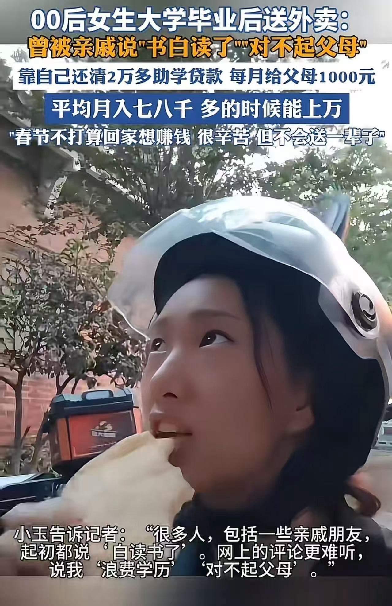 宁愿在出租房送外卖,也不愿春节回老家听亲戚冷嘲热讽!这是一个关于勇气、坚持与自我价值的故事,也是无数年轻人在现实压力下的真实写照。00后女生大学毕业后,选择了送外卖这个看似普通却充满挑战的职业,她用行动告诉世界:我靠自己,不丢人! 故事的起点并不平凡。她曾是校园里的优等生,成绩优异,梦想远大。然而,社会的残酷现实让她意识到,光有梦想还不够,真正的独立,是在风雨中坚强前行。毕业后,她没有选择“安稳”的公务员或白领工作,而是投身于快递配送的第一线。有人说:“你书白读了,还是在送外卖。”亲戚的冷言冷语像刀子一样刺在心头,但她没有退缩。 春节期间,许多同龄人回家团聚,享受天伦之乐,而她却在陌生的城市坚守岗位。面对亲戚的质问,她坦然回应:“我靠自己,不丢人!”这不仅是一句简单的自我肯定,更是一种对传统观念的反击。她用实际行动证明:年轻人可以有自己的选择,生活不一定要按照别人的期待走。 她的故事激励着无数像她一样的年轻人。不是每个人都能一帆风顺,但只要心怀梦想,敢于面对现实的挑战,就能在平凡中创造不平凡。她用行动告诉我们:不论职业多普通,只要努力、坚持、热爱,都是值得尊重的。她的坚韧和勇气,正是新时代青年的真实写照。 更令人动容的是,她的内心没有被偏见击垮。她深知,社会对“送外卖”的偏见只是一时的,真正重要的是自我价值的实现。她用实际行动打破了偏见,让那些曾经质疑的人重新审视了“努力”的意义。 这个故事也让我们反思:在传统与现代价值观的碰撞中,年轻人如何坚持自我?如何用行动赢得尊重?答案很简单——勇敢做自己,不被偏见左右,用实力证明一切。 读到这里,你是否也被她的勇气打动?你是否也在生活中遇到过类似的质疑?欢迎在评论区分享你的故事,让我们一起为那些勇敢追梦的年轻人喝彩!因为,每一个坚持自我、勇于突破的你,都是这个时代最美的风景。 她的故事还在继续,你准备好为自己的人生写下精彩的一笔了吗?