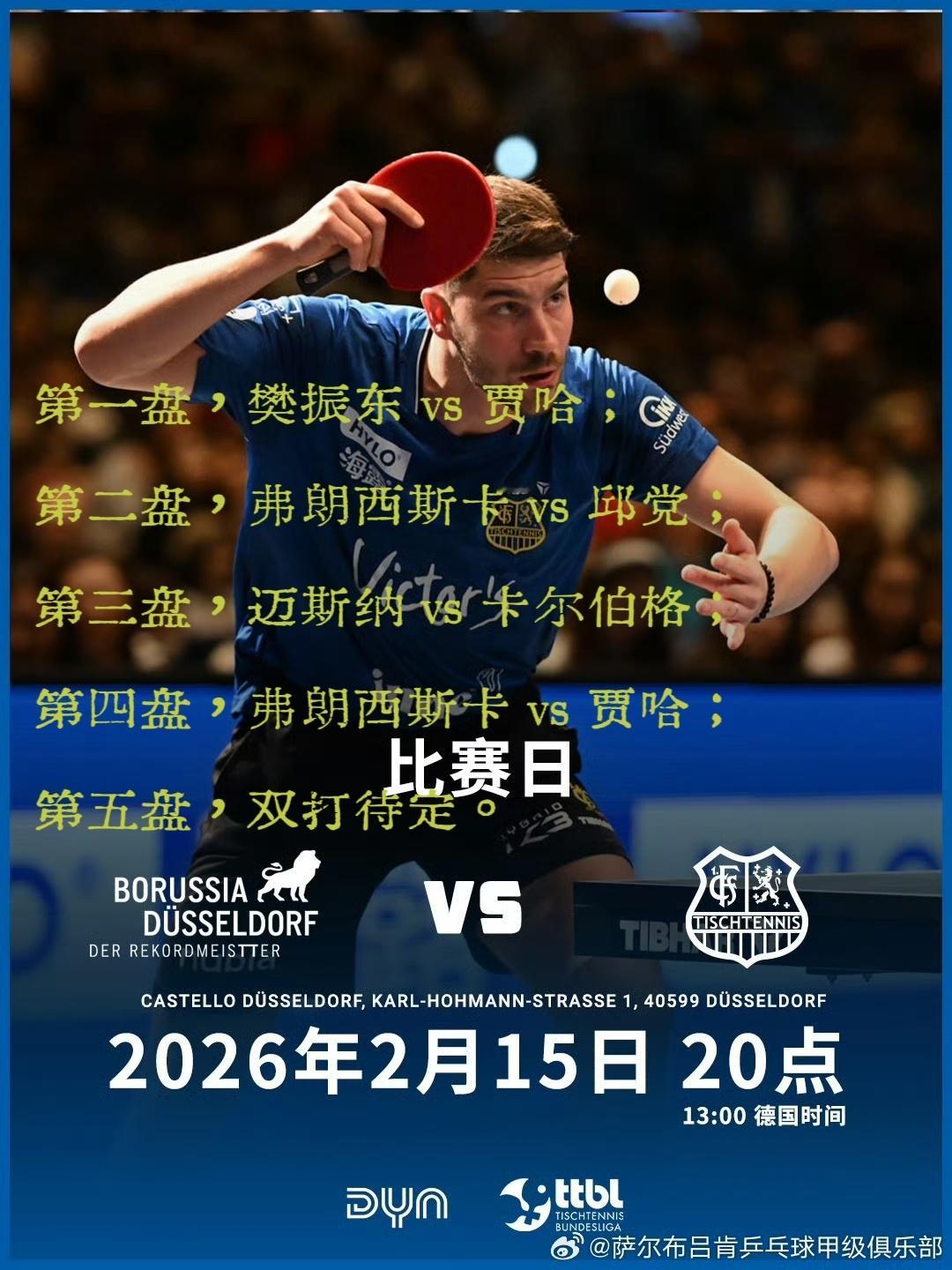 德甲第十七轮萨尔布吕肯对阵杜塞尔多夫对战表已出:弗队是一单,没想到老萨尔没有派出最强阵容!不管如何安排还是那句话“樊振东加油!萨尔布吕肯队加油!”(萨尔是客场作战)
