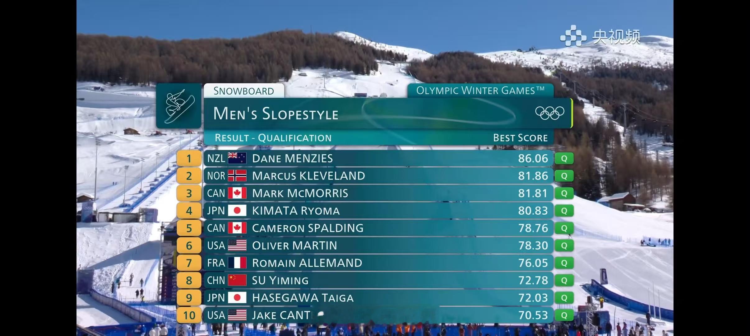 2026年米兰科尔蒂纳冬奥会单板滑雪男子坡面障碍技巧资格赛1.🇳🇿戴恩·孟席斯86.06分 Q2.🇳🇴马库斯·克莱韦兰81.86分 Q3.🇨🇦马克·麦克莫里斯81.81分 Q 4.🇯🇵木俣椋真80.83分 Q5.🇨🇦卡梅伦·斯波尔丁78.76分 Q6.🇺🇸奥利弗·马丁78.30分 Q7.🇫🇷罗曼·阿勒芒76.05分 Q 8.🇨🇳苏翊鸣72.78分 Q9.🇯🇵长谷川帝胜72.03分 Q10.🇺🇸杰克·坎特70.53分 Q11.🇺🇸雷蒙德·杰拉德70.00分 Q12.🇳🇴蒙斯·勒伊斯韦兰69.63分 Q资格赛前12晋级决赛!苏翊鸣晋级坡障决赛苏翊鸣第二滑72.78分