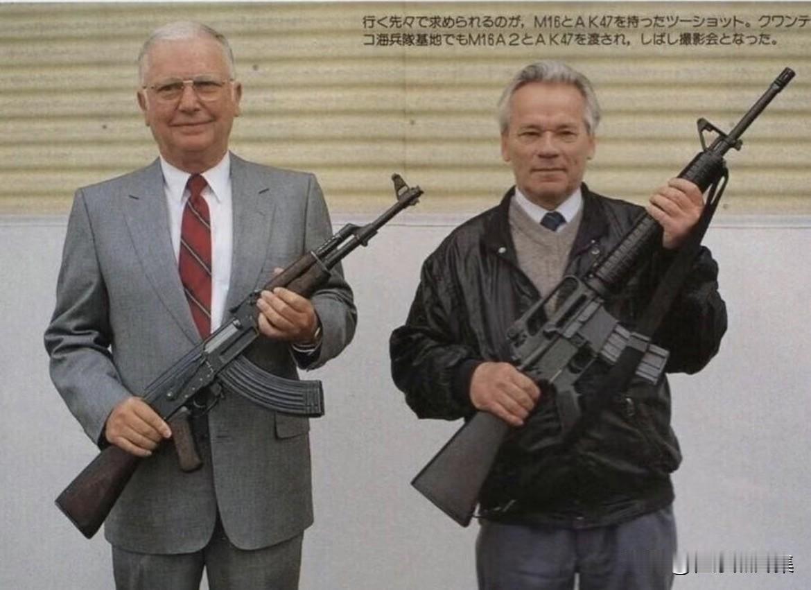 1990年,代表东西方轻武器设计巅峰的两位“枪王”——苏联的米哈伊尔·卡拉什尼科夫与美国的尤金·斯通纳在美国海军陆战队的一座基地内历史性会面。期间,两人拿起对方设计的传奇步枪,卡拉什尼科夫手持美军的M16A2,而斯通纳则端着苏制的AK-47(如图)。