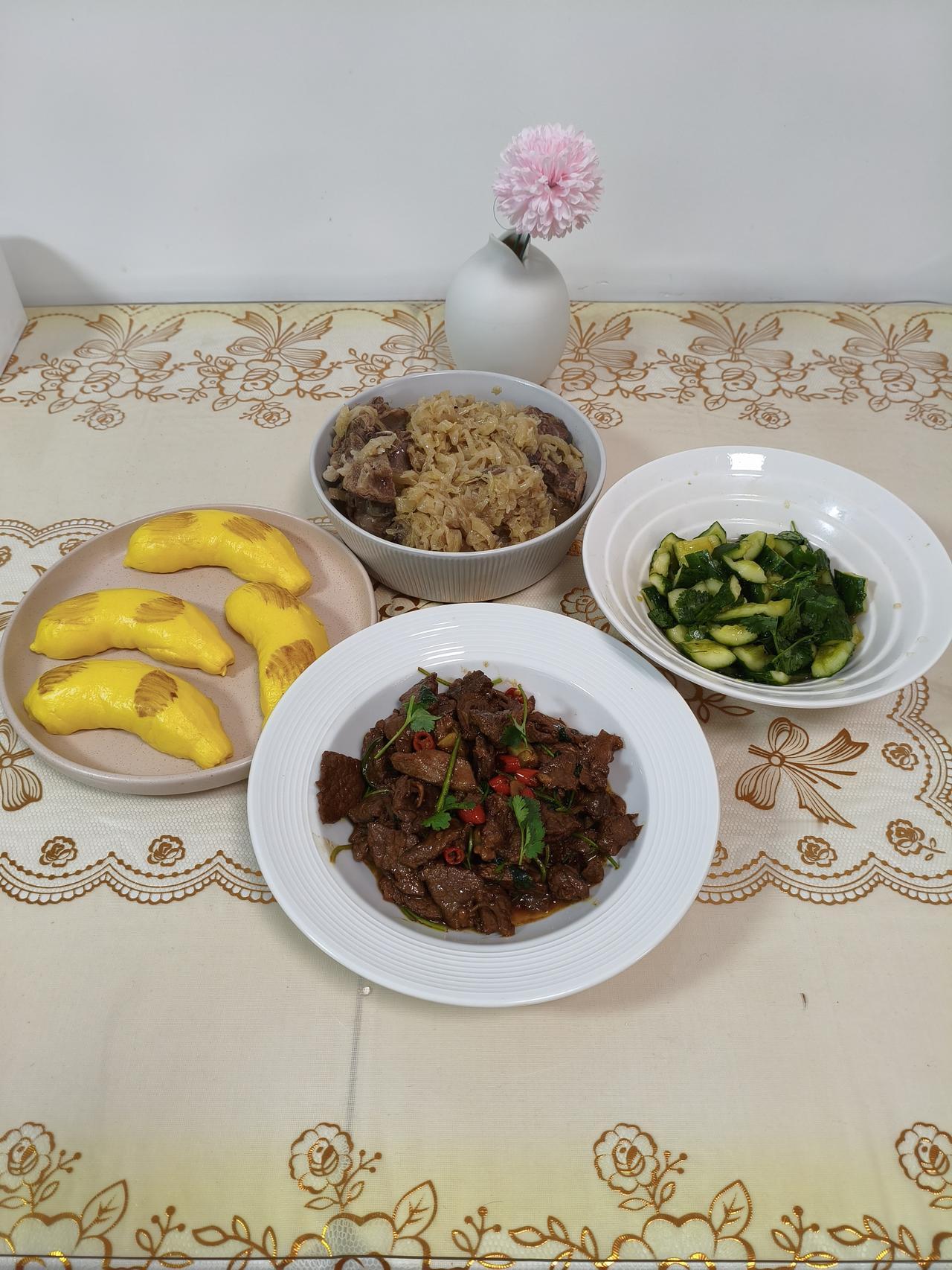 给闺女做的第二顿饭,酸菜炖排骨,小炒黄牛肉,拍黄瓜。小炒黄牛肉做的特成功,被她全吃光。香蕉包一屉10个,我俩也全吃了。春节期间,每道菜就得少做,才能实现光盘行动。