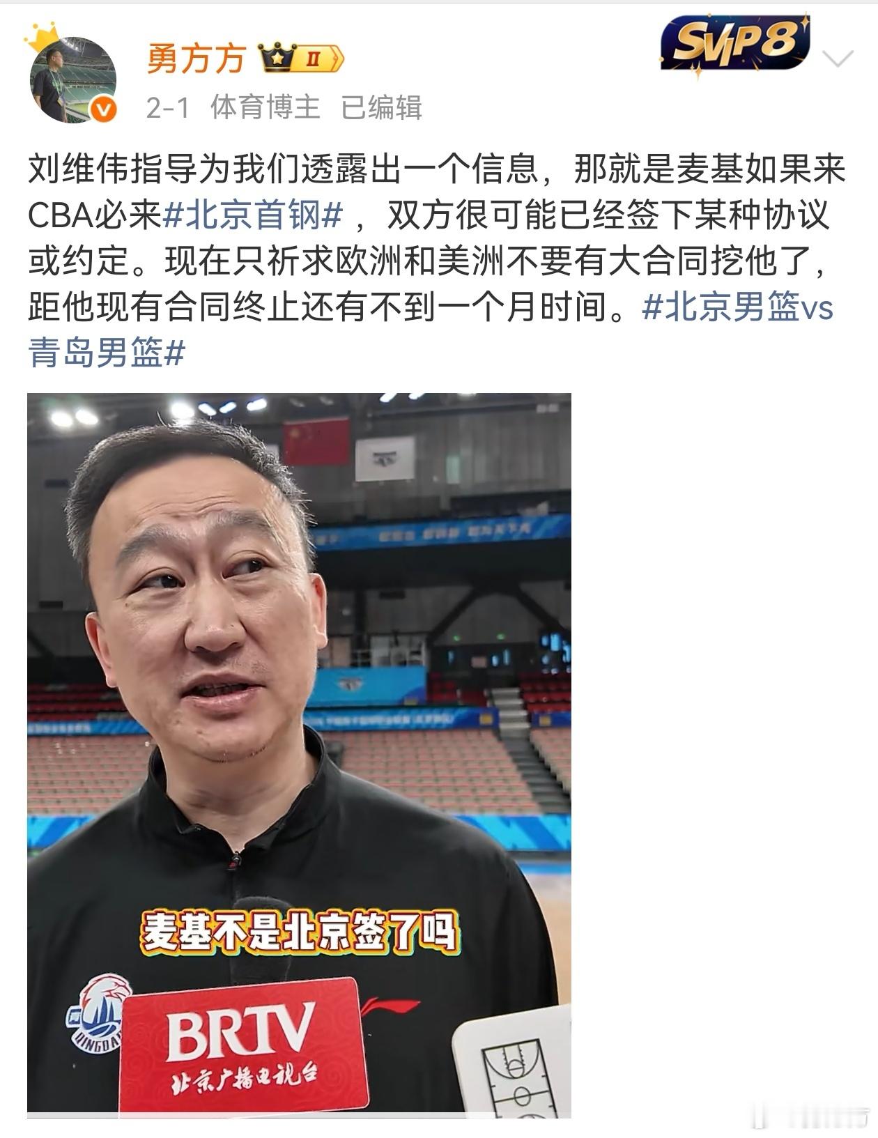 图5:2月1日,刘维伟指导采访替首钢宣,麦基预签了协议,来CBA必来首钢,只看还有没有其他联赛大合同挖他。