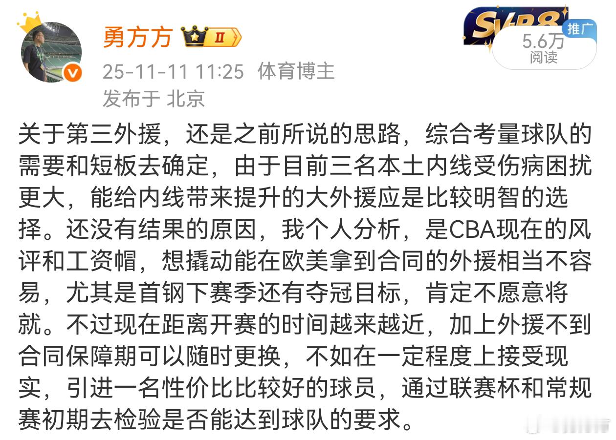 麦基到来将大概率替换马帝昂,我了解到已经有一些国内NBL球队对芒果产生了兴趣。至于首钢是否会更换小外援,目前尚无明确消息,与其他回国和出国度假的外援不同,贝利在这个假期选择留在了国内,应该是想更好地了解和融入中国。