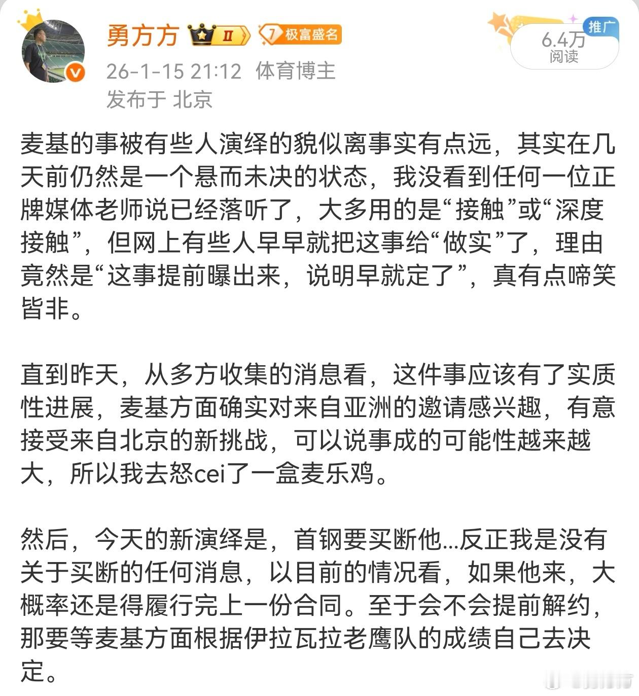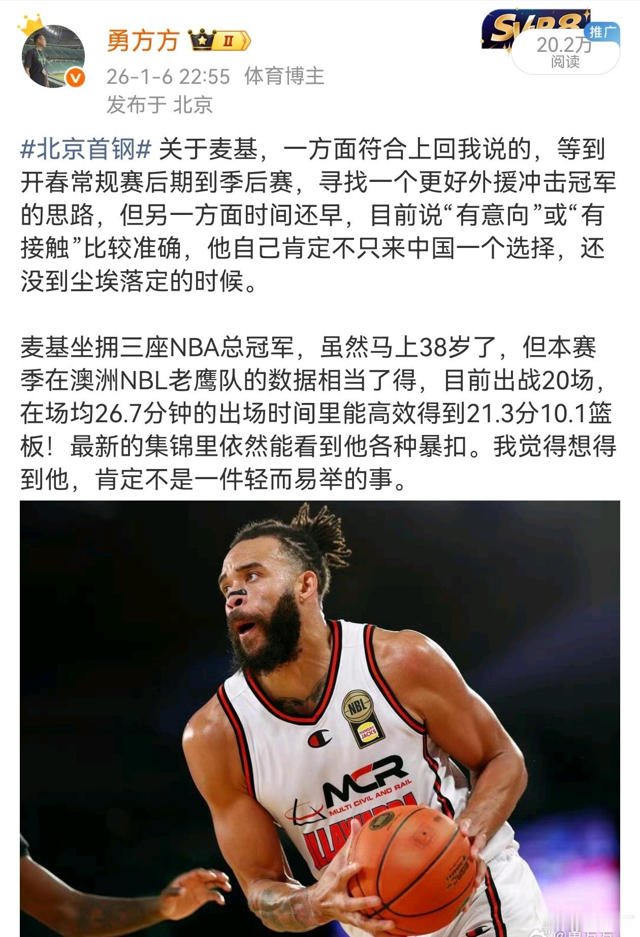 图2:1月6日,大佬们爆料,首钢开始接触麦基,可见俱乐部没有放弃引进优质大外的计划,开始接触的时间应该是在元旦前,不过当时只是接触,一切尚无定论。