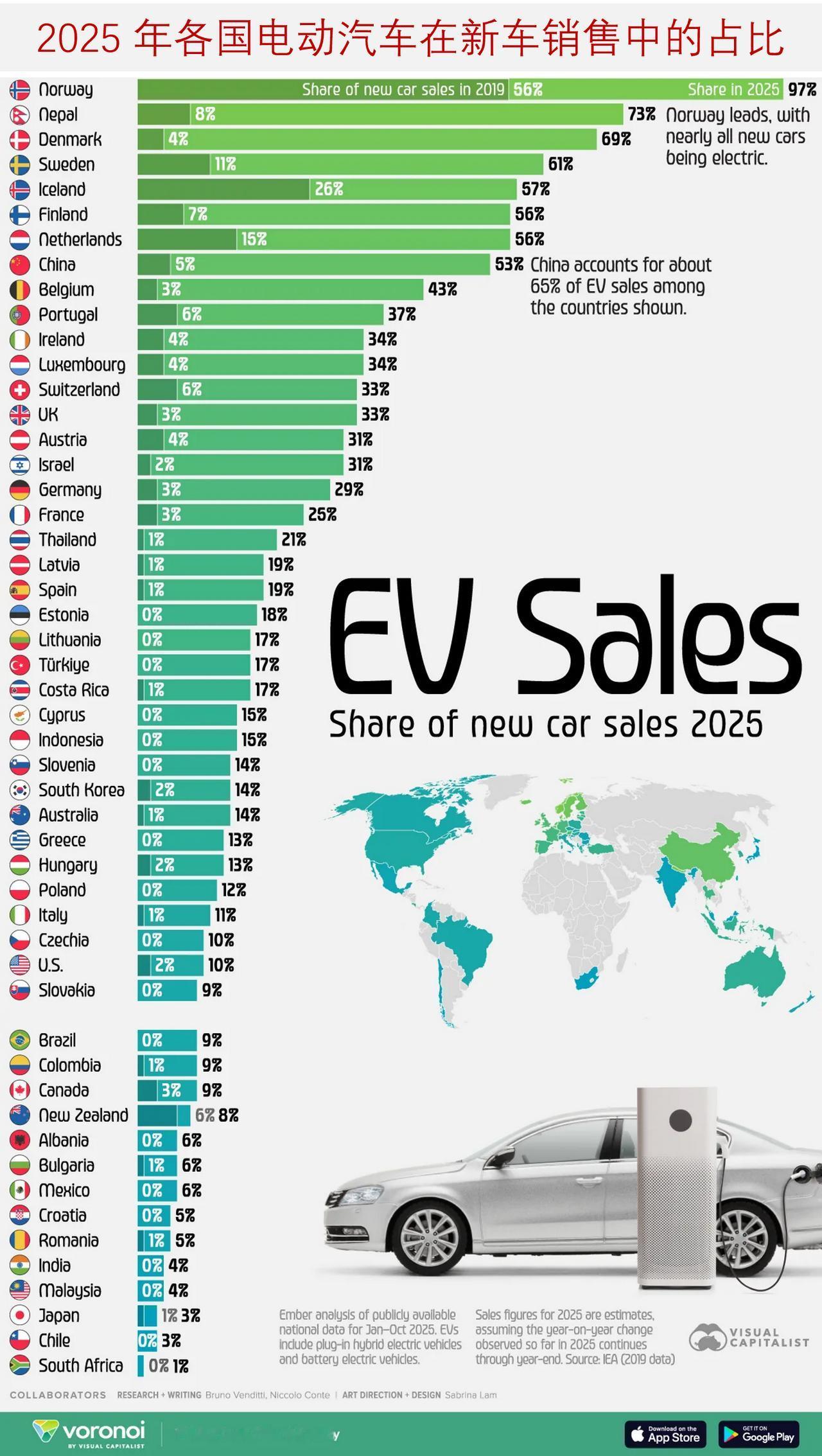 一览2025 年各国电动汽车在新车销售中的占比 2019 年,在大多数国家,电动汽车仍属于小众产品,其在新车销售中的占比仅为个位数。 到 2025 年,电动汽车已在多个市场从小众产品转变为主流产品。在挪威,电动汽车预计将占新车销量的 97%,这意味着几乎每辆新售出的汽车都是电动汽车。其他一些国家也超过了 50% 的比例,而在中国,电动汽车在全球最大的汽车市场的新车销售中占比超过一半。 下面这张信息图表展示了 2019 年至 2025 年期间电动汽车销量占比的变化情况。该图表所呈现的数据来自国际能源署(IEA)和Ember公司。电动汽车包括纯电动汽车(BEV)和插电式混合动力电动汽车(PHEV)。2025 年的销售数据为估算值。 综合来看,这些数据表明,在全球汽车市场中,电动汽车的普及速度从早期的少量应用迅速发展到了主流应用的阶段。 ——挪威确立了全球标准标杆 挪威仍是全球电动汽车普及率最高的国家。2019 年,该国电动汽车的销量已占新车总销量的 56%。到 2025 年,这一比例预计将达到 97%,意味着几乎每辆新售出的汽车都是电动汽车。这种迅速的转变是由强有力的政策激励措施、税收减免以及广泛的充电基础设施所推动的。 尼泊尔在全球排名第二,预计2025 年电动汽车在新车销售中的占比将达到 73%——这一比例与 2019 年的 8%相比,发生了显著的变化。 其他北欧国家的这一比例也位居前列。据估计,瑞典在 2025 年达到 61%,而芬兰和丹麦的这一比例均超过 50%。 ——中国在总量上占据主导地位 虽然挪威在比例方面占据领先地位,但中国在绝对数量上占据优势。据估计,2025 年,中国的电动汽车销量将超过 1320 万辆,占新车销量的 53%。这使得中国不仅成为电动汽车销量最大的市场,也是市场份额增长最快的市场之一。 相比之下,2025 年,美国的电动汽车销量占比预计达到 10%,届时将售出约 160 万辆电动汽车。加拿大则略落后一些,占比为 9%。最近,加拿大政府同意取消对每年 49000 辆中国制造的电动汽车的 100% 关税限制。 ——欧洲的全面加速发展 欧洲在主要经济体中呈现出最为广泛的增长态势。像比利时(43%)、荷兰(56%)、葡萄牙(37%)和英国(33%)这样的国家,自 2019 年电动汽车市场份额大多低于 10%以来,都经历了显著的增长。 即便是那些传统上较为迟缓的采用者,如意大利和西班牙,其电动汽车的普及率也已达到两位数。在整个地区,电动汽车的销量不仅在份额上有所增长,其销量规模也大幅上升。仅德国一国,预计在 2025 年的电动汽车销量将超过 84 万辆。 ——新兴市场势头增强 除欧洲和中国外,新兴市场汽车电动化也正在发展,尼泊尔尤为突出,预计2025 年其电动汽车的市场份额将达到 73%,尽管其起步规模较小。泰国(21%)和印度尼西亚(15%)正在成为东南亚地区的领军者。 在拉丁美洲,巴西的电动汽车占比已升至 9%,而墨西哥则达到 6%。