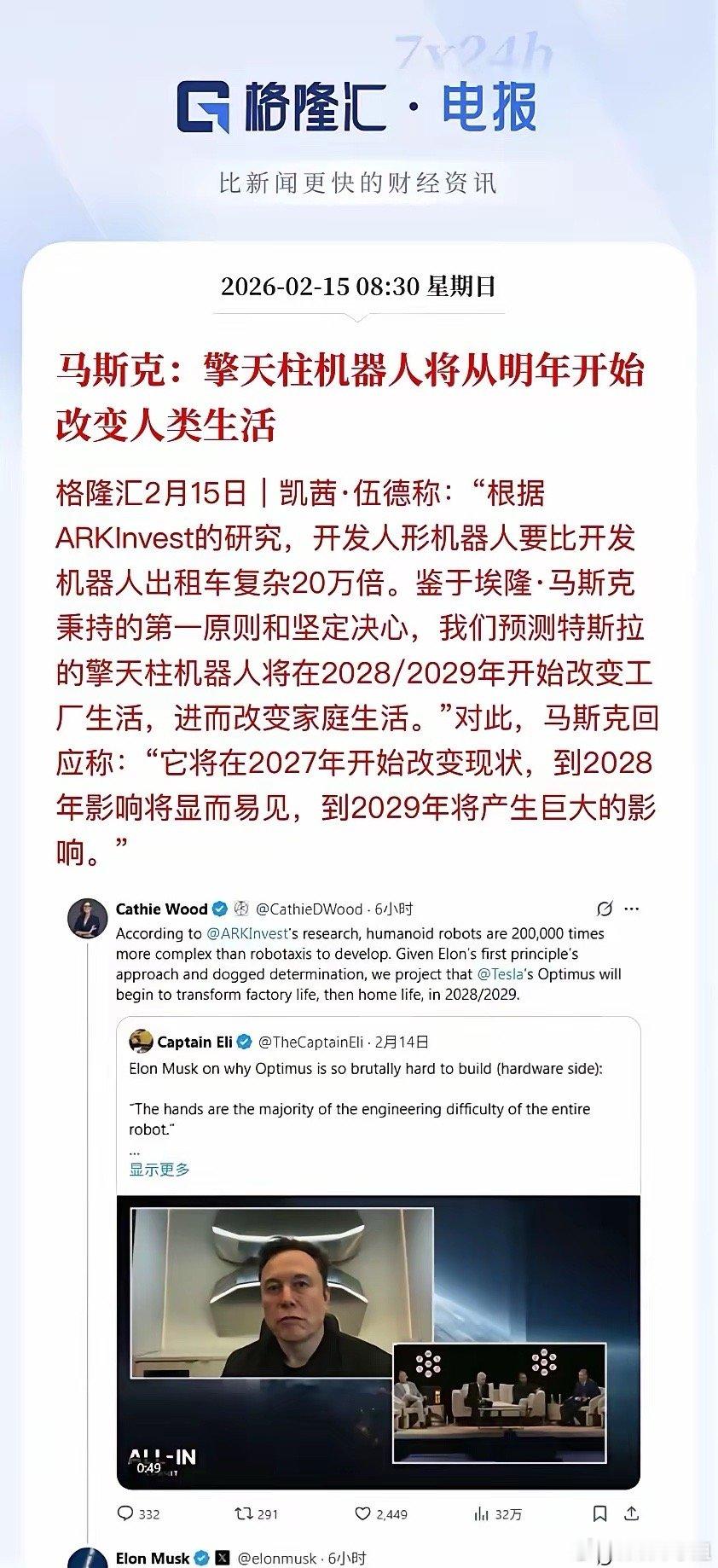 🔥马斯克炸场!擎天柱量产提前!人形机器人万亿赛道正式引爆马斯克重磅官宣:特斯拉擎天柱2027年改变人类生活,节奏比华尔街最乐观预期还早1年!2027落地→2028显效→2029爆发,人形机器人从概念直接进入商业化倒计时!木头姐直言:人形机器人复杂度是机器人出租车的20万倍。马斯克直指量产,意味着万亿级赛道正式开启。✅ 中国供应链是擎天柱量产核心,70%零部件来自国内✅ 特斯拉深度绑定的A股精密制造企业,最先吃红利✅ 减速器、伺服、传感器、结构件全线爆发核心受益标的(全产业链梳理)执行器&结构件- 拓普集团:关节执行器核心,特斯拉深度绑定- 旭升集团:关节镁合金壳体独家,轻量化核心- 蓝思科技:整机组装+玻璃面罩+壳体- 世运电路:PCB主控板/电源板独家供应减速器(核心心脏)- 绿的谐波:谐波减速器龙头,获万台订单- 双环传动:RV减速器核心,进入验证- 中大力德:行星减速器,国产替代主力- 兆威机电:灵巧手齿轮箱方案龙头电机&驱动- 鸣志电器:空心杯电机,灵巧手驱动核心- 卧龙电驱:无框力矩电机,全身关节驱动- 汇川技术:伺服系统+驱控一体化传感器- 柯力传感:六维力传感器,关节精准力控- 汉威科技:柔性触觉传感器- 金力永磁:稀土永磁材料,机器人电机独家