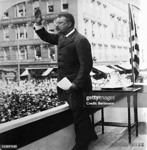 这张照片展示了美国第 26 任总统西奥多·罗斯福(Theodore Roosevelt)于 1903 年 4 月 29 日在密苏里州汉尼拔(Hannibal, Missouri)的联合车站(Union Depot)发表演讲的历史瞬间。 1903 年 4 月,时任总统罗斯福在汉尼拔向聚集的人群发表讲话。为了能够清晰地听到总统演讲,当时的人们聚集在周围的屋顶上,甚至有人攀爬在电线杆(Telegraph poles)上。 这张照片由 Underwood & Underwood 拍摄,捕捉到了罗斯福总统站在平台(据描述为桌子)上进行富有感染力演讲的姿态。 西奥多·罗斯福(1901-1909 年在任)以其充满活力的个性和“温言在口,大棒在手”(Speak softly and carry a big stick)的外交政策而闻名。他是一位多才多艺的人物,曾担任纽约州州长,并作为“粗鲁骑手”(Rough Riders)的领导者参加过美西战争。