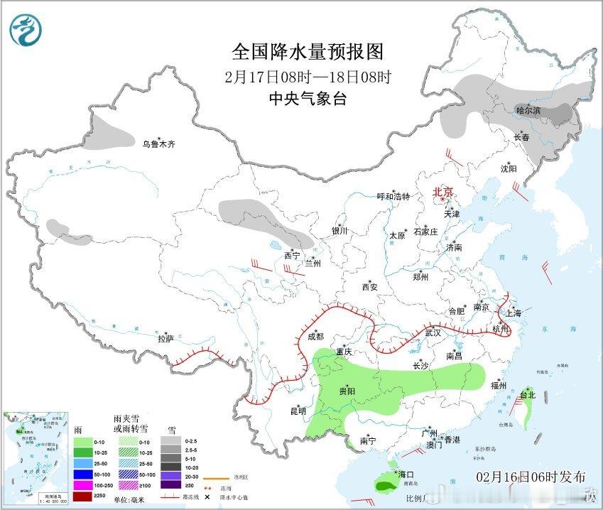 今天冷空气继续南下,降水总体向南推进,降水区相对偏北的湖北北部、安徽中部、江苏西南部可能有雪或雨夹雪。湖南东北部、江西北部、浙江中南部可能有中雨。明后两天南方降水会继续缩减。北方地区今后三天晴天为主,不过今明两天在新疆伊犁河谷、甘肃西部,明天吉林和黑龙江中南部,有降雪。