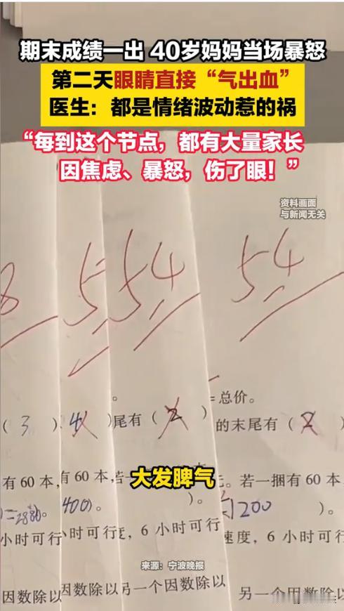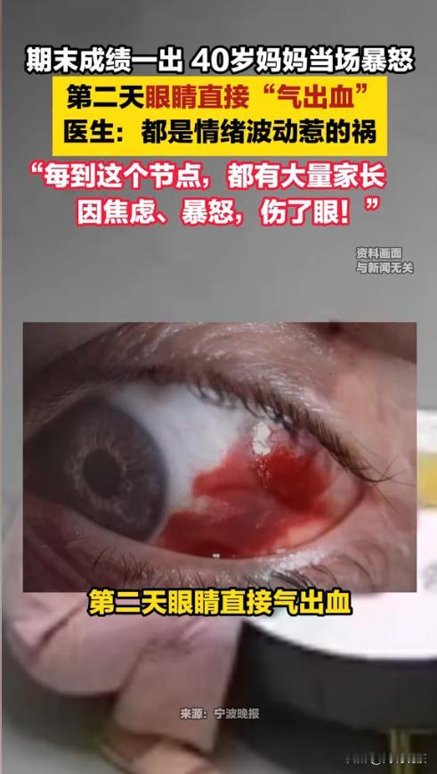 “悲剧还是发生了!”近日,浙江,一女子在拿到孩子的期末成绩单后,顿时大怒雷霆,只因为孩子的成绩和自己要求的实在差太多,本以为骂过一顿之后也就出出气,没想到第二天竟发现眼睛“出血”了!医生:情绪激动使血压飙升导致的! 每到期末考试季,都是对家长和孩子的双重考验,这位宁波妈妈的经历,更是让无数家长感同身受。 据媒体2月4日报道,这天晚上,孩子小心翼翼的将成绩单拿给妈妈看。当看到孩子远低于预期的成绩单时,这位妈妈瞬间情绪失控,血压急剧升高。随后就对孩子进行了一顿“教育”。 本想着训孩子一顿出出气,自己也就好了。可第二天早上起来时,女子就觉得眼睛不舒服,又干又疼。结果一照镜子才发现,眼球周围冲了一大块雪,吓得她赶紧到医院检查。 医生诊断为“结膜下出血”,罪魁祸首正是她当时的暴怒情绪。原来,人在极度生气时,血压会突然升高,脆弱的眼部结膜血管就可能因此破裂出血。 医生表示,这种情况通常不会影响视力,但眼睛里的血块需要一到两周才能完全吸收,过程十分煎熬。 这件事也提醒我们,情绪激动不仅伤眼,更会对心脑血管造成巨大冲击。所以家长在面对孩子的成绩时,一定要学会控制情绪,理性沟通,避免用伤害自己身体的方式来表达不满。 信息来源:《期末成绩一出,40岁妈妈当场暴怒,第二天眼睛直接“气出血”!医生:都是情绪波动惹的祸》豫视频