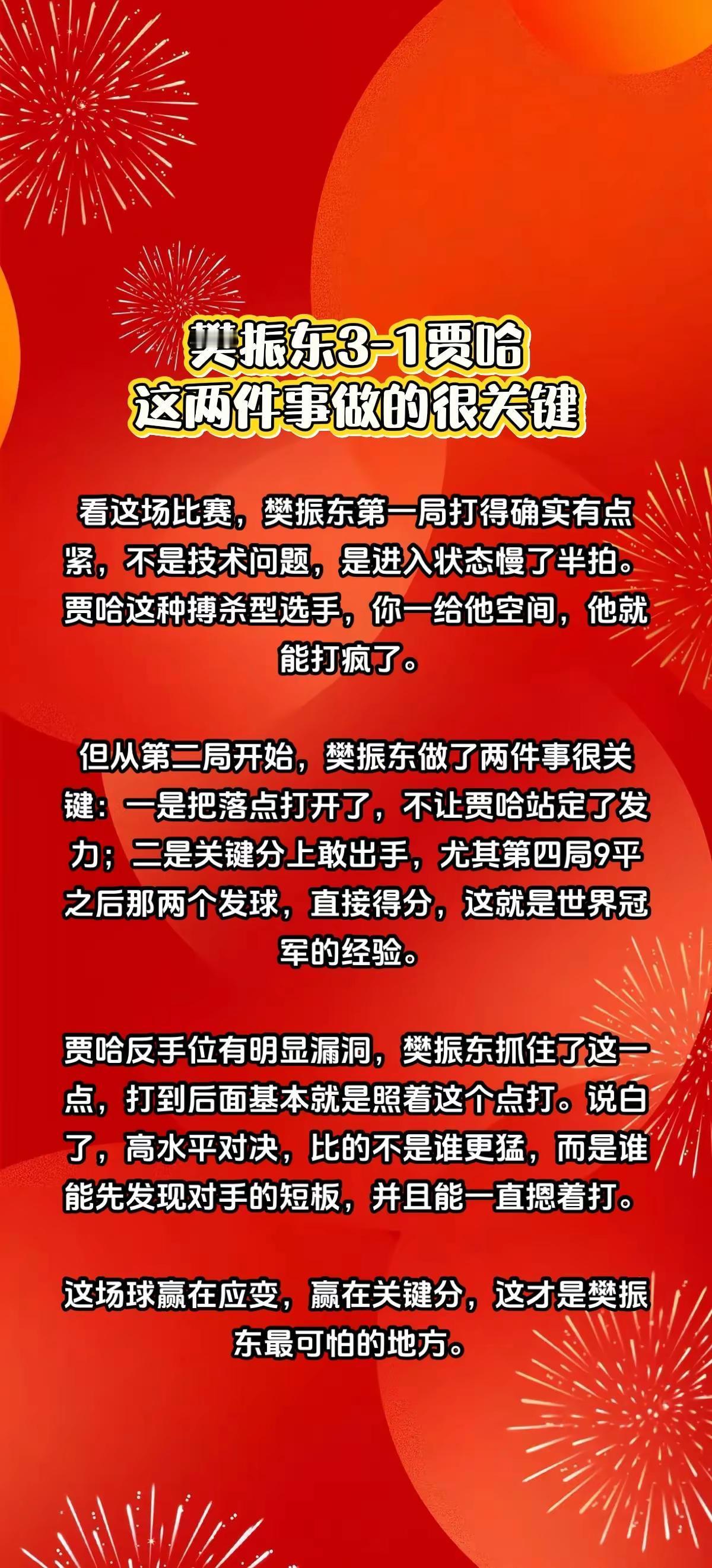 樊振东3-1贾哈,这两个关键算是走对了。樊振东精选