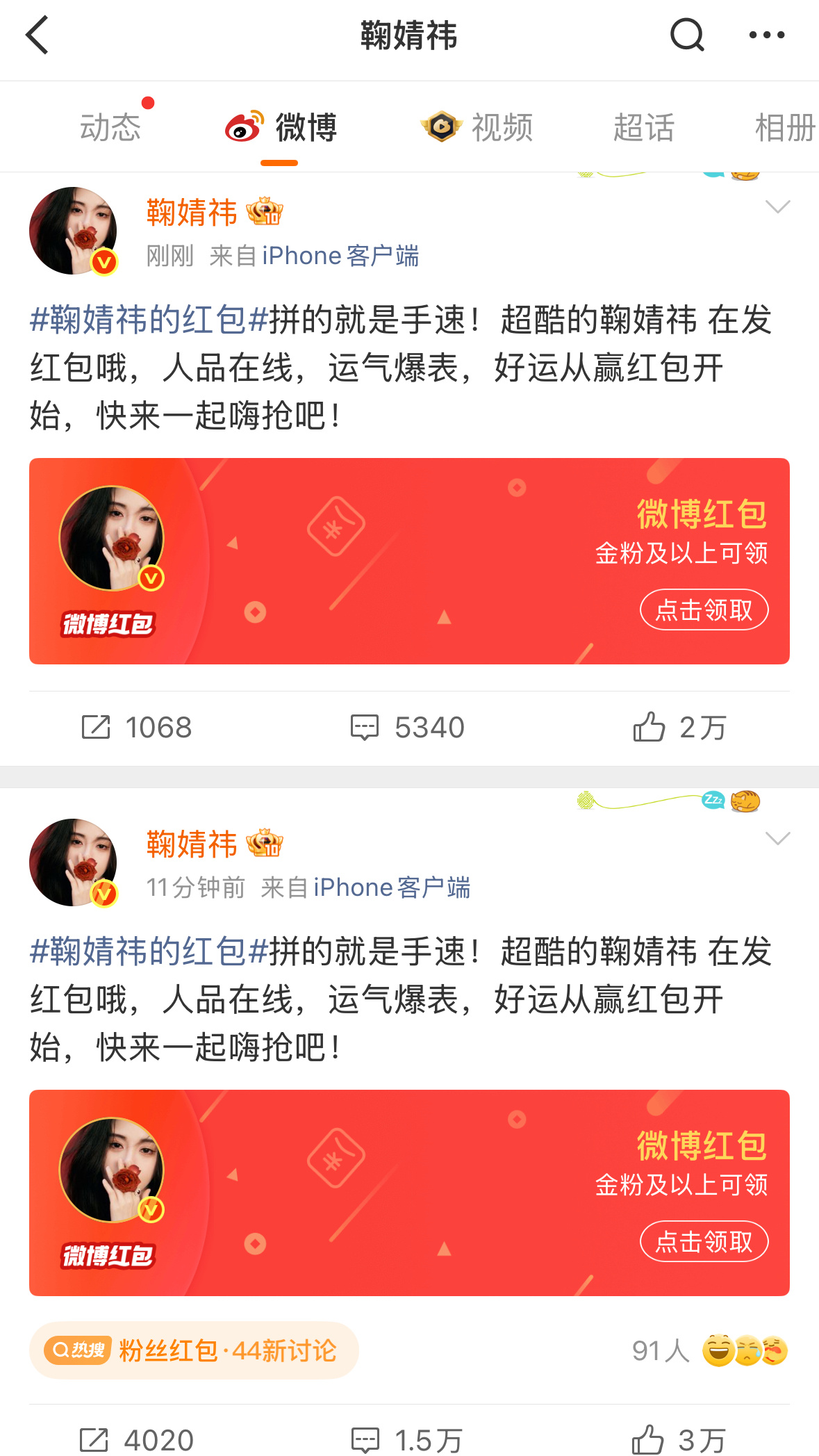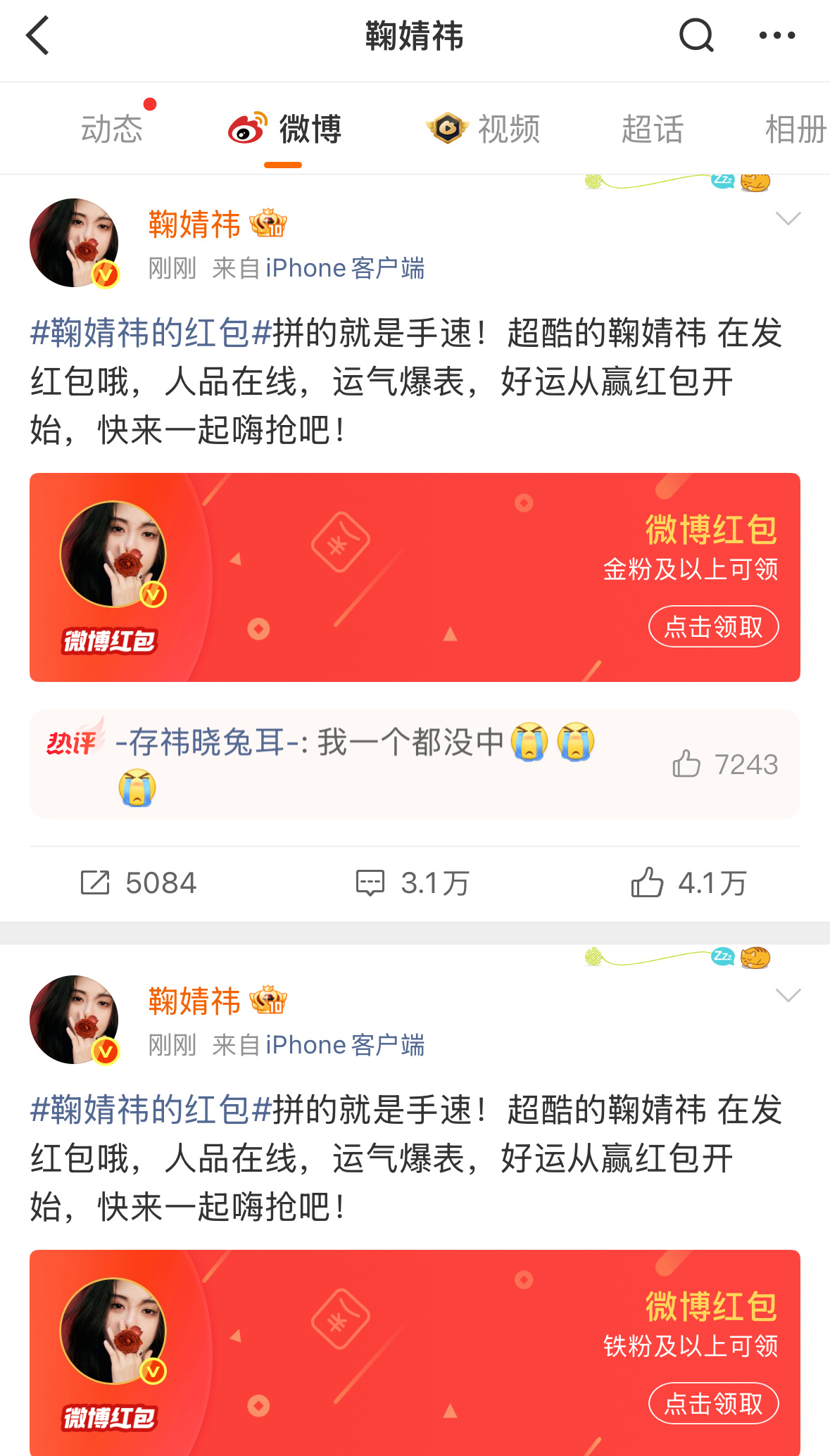 鞠婧祎太大气了!一下发了4个49999的🧧。这么多都被谁抢走了????!!!!!我没抢到。。。。