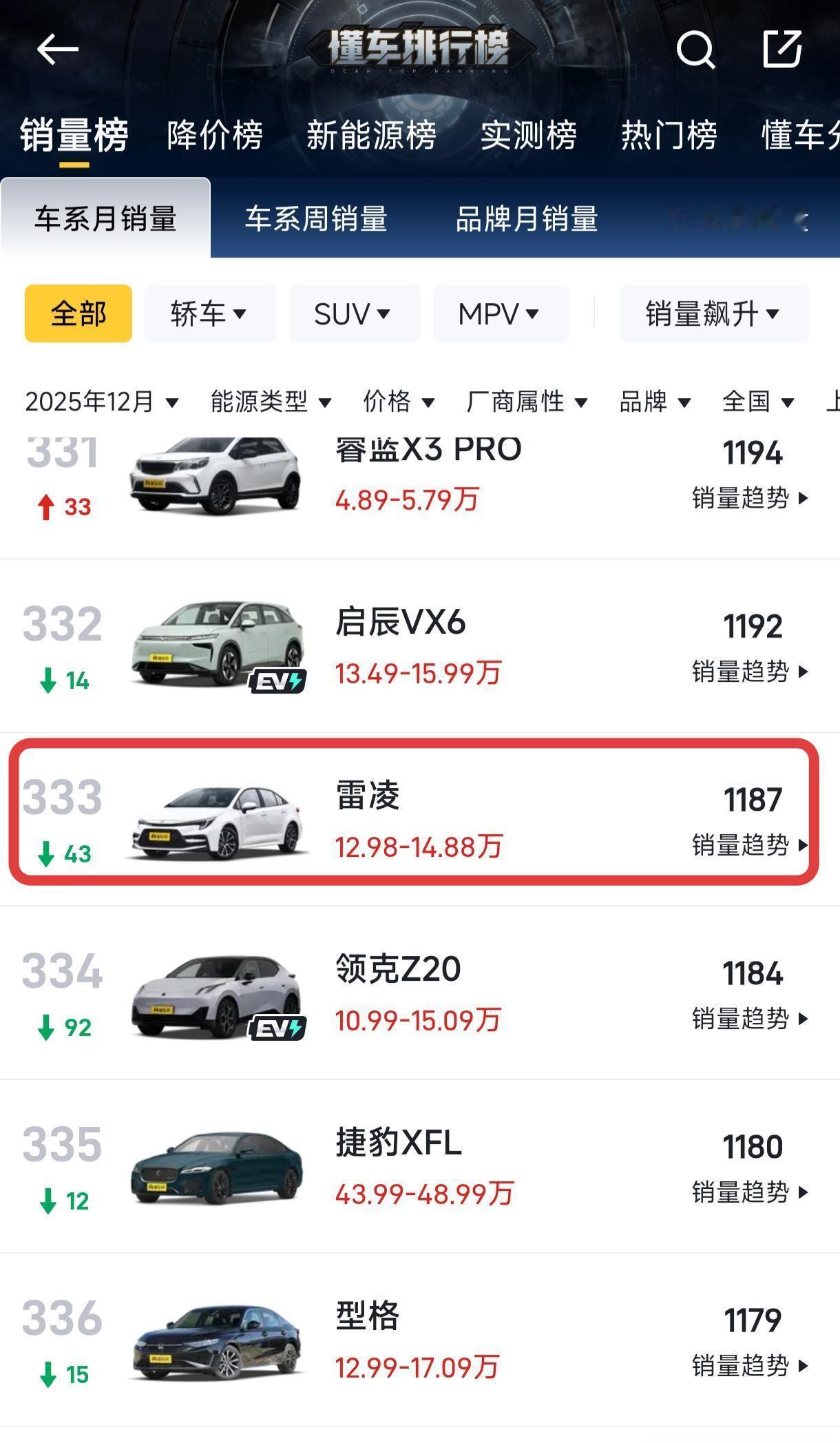 想到过雷凌的销量会下跌,没想到跌到了马里亚纳海沟! 节前验了一台丰田雷凌,2021年4月上牌的1.8双擎,跑了6万多公里,二手行情6捆上下。 验车之前,上平台比对配置,注意到了这车的销量,只有一千多点儿,我天,都这么惨了! 想当初,巅峰月销量可是2万8呀,年销量20万+,如今成了无人问津的孤儿!这可是丰田呀! 说白了,价钱还是贵,新车裸车9捆,落地11捆,比轩逸朗逸高太多; 甚至和自家的锋兰达一个价位,但锋兰达空间大,排量也大,那谁还买你的雷凌呀? 包括二手车的价格也贵的不行,都五个年头了,6个多达不溜,只比新车少3个达不溜,性价比在哪里? 而且车况也不够精品,有诸多瑕疵,外观三个面喷漆,两个面钣金,内饰座椅骨架生锈,转向管柱生锈,发动机渗油。 最终的建议,可以买,但应该有更好的选择。
