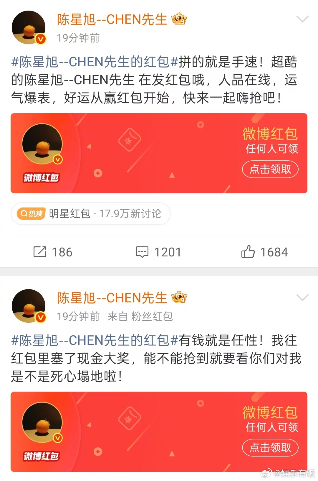 陈星旭发红包了 除夕夜率先发红包啦!连续发三个无门槛红包🧧看看是谁抢到啦?