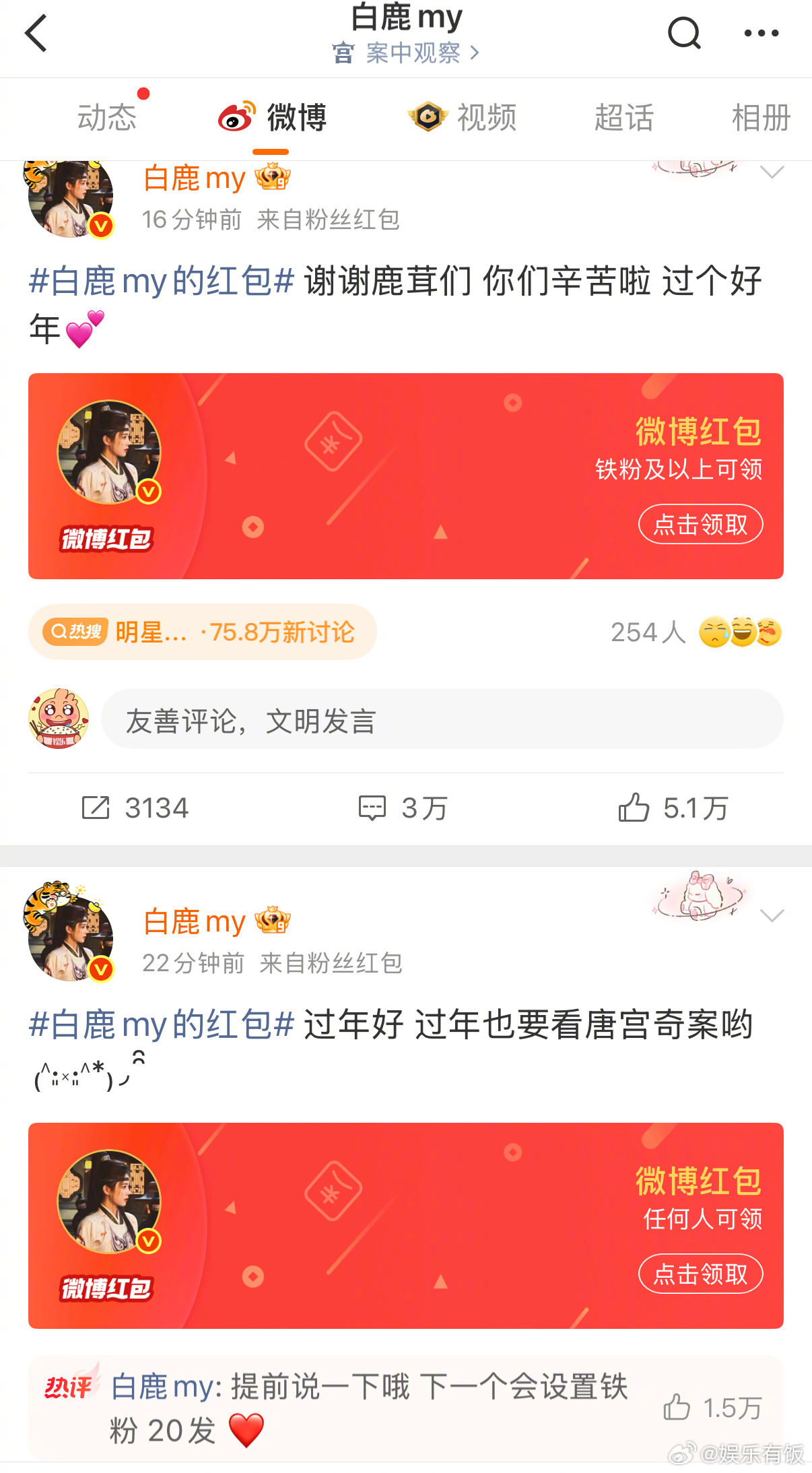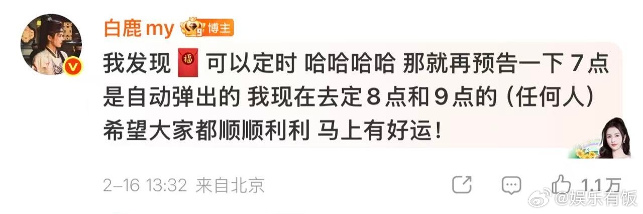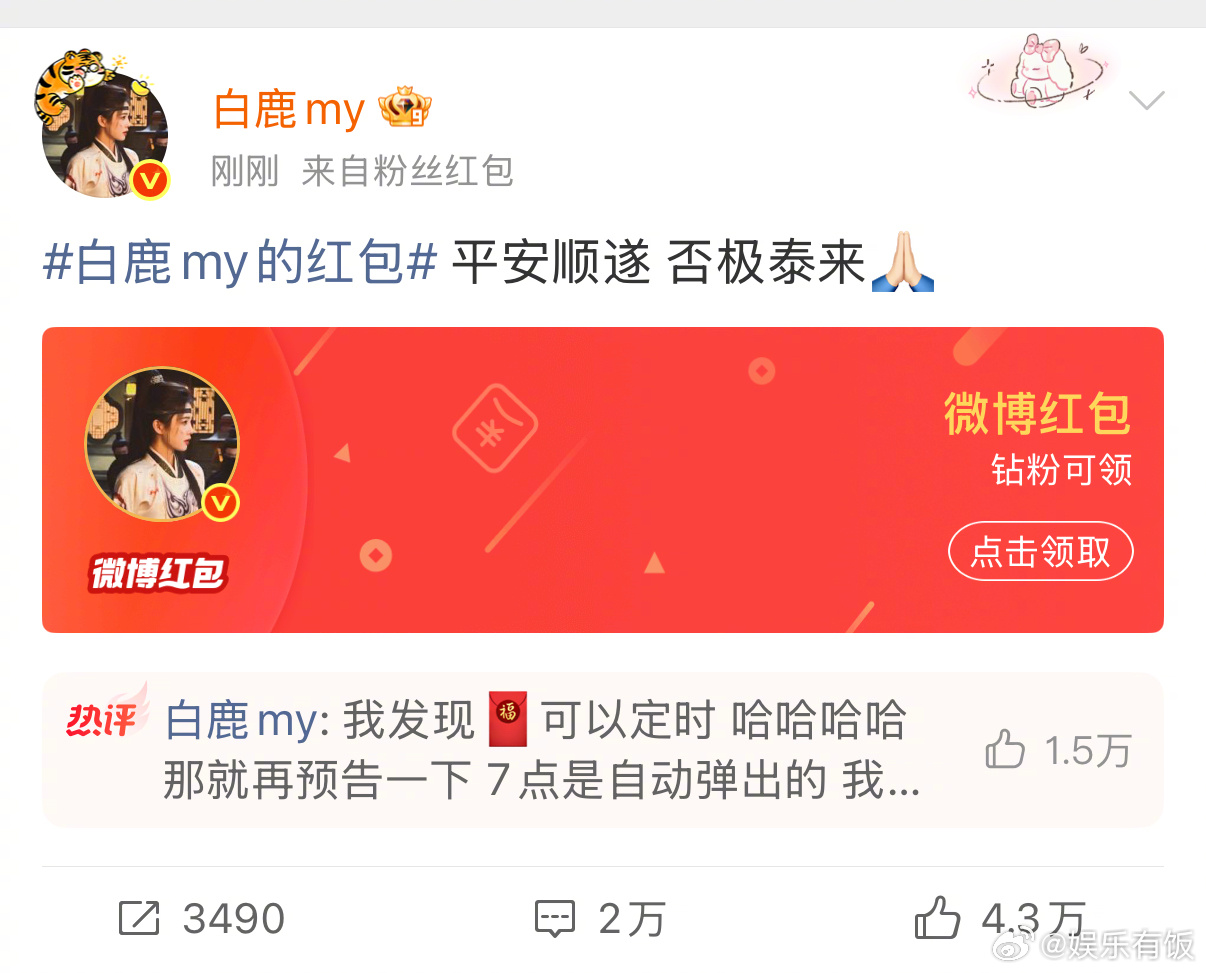 白鹿预告今晚789点都有红包白鹿发红包主打一个雨露均沾 给钻粉、铁粉和所有人都发了红包,还贴心预告了今晚7、8、9点还会有定时红包!