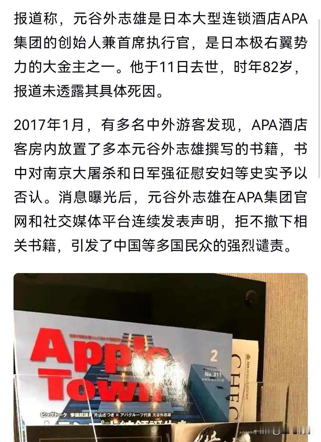 这个日本人也太没底线了吧,他竟然否认南京大屠杀。 要知道南京大屠杀是实实在在的发生过的真实事件,造成这么多中国人死亡,这个日本人竟然拒绝承认发生过南京大屠杀,还有王法吗?还有天理吗? 2月14日报道,否认南京大屠杀的日本酒店老板日前死了。