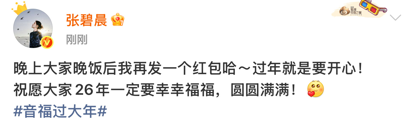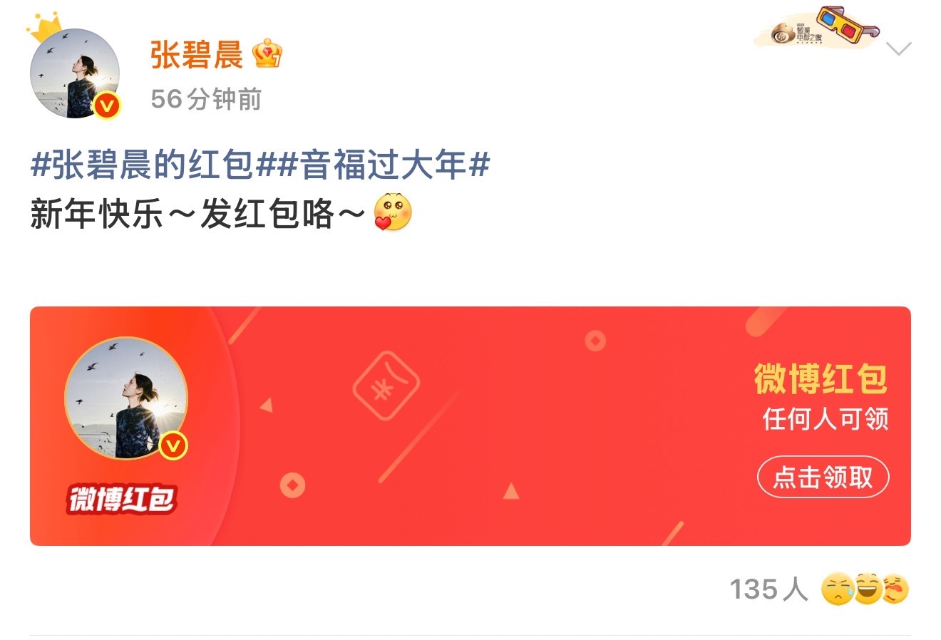 张碧晨5万红包 春节的第一波明星红包来啦🧧张碧晨发了五万的无门槛红包,真的人美心善了还预告晚饭后还要发红包哈哈哈!!我已经准备好了!!