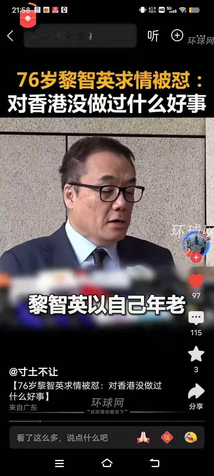 黎智英现在终于知道后悔了,当初还口出狂言,我不怕坐牢,坐一下也无所谓,反正也快80岁的人了,能把我怎么样呢?当锃亮的手铐和脚链带上的时候,宣判20年定板时,彻底傻了眼,知道是要动真格了,法律不是儿戏?倚老卖老行不通了。紧张害怕了,他急忙给法官求情,说自己已经78岁了,能不能轻判?身体有很多毛病,想早点出来享受一下天伦之乐。你说得出口?真是滑稽好笑?你不是自嗨坐一坐牢无所谓吗?反正岁数已高?现在知道装可怜了?早干什么去了?知法犯法,罪该万死,作为新闻主编,什么法你不知道?故意搞破坏搞分裂,这是国家的底线。不容许任何人践踏挑战。自己组织教唆动乱的时候怎么没想到会今天的结果呢?没想到身体有毛病,为什么不想到安分守己晚年好好享受幸福生活?现在不说坐牢无所谓了?这不自相矛盾,脸伸出来欠抽吗?只想说的是这都是黎智英自找的,没人同情的,牢底坐穿就好!