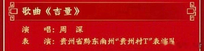【周深和贵州村T一起上春晚】 周深春晚演唱歌曲吉量周深 2月16日,中央广播电视总台《2026年春节联欢晚会》节目单发布,其中,贵州省黔东南州“贵州村T”表演队表演、周深演唱的歌曲《吉量》将登上央视春晚。期待!