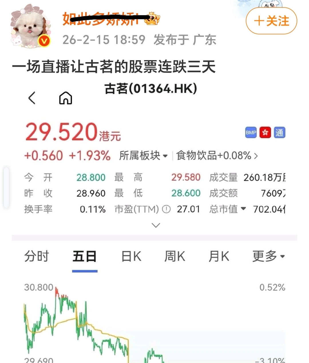 老麻粉又出来闹笑话了❎打假老麻洗脑话术 虞书欣直播是2月12日,当天古茗只跌了1.4%,第二天就涨回去1.9%。所谓“连续跌三天”是断章取义,把之前的下跌也算进去了黑虞书欣6个月了还不够吗 现在还用上股票了 你们老麻粉太离谱了