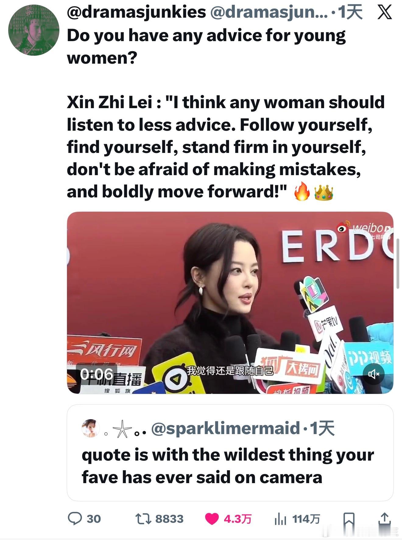 【热推4.3赞】辛芷蕾这段话在外网也火了~🫶如何找到并勇敢表达独特的自我,你有什么样的建议辛芷蕾:年轻女性我觉得年轻女性,我觉得任何女性还是少听建议吧。因为没有任何一条建议是真正正确的,也没有一条道路是绝对正确,绝对完整的。我觉得还是跟随自己找到自己,然后坚定自己,不用怕犯错,就是大胆的往前走就好了。