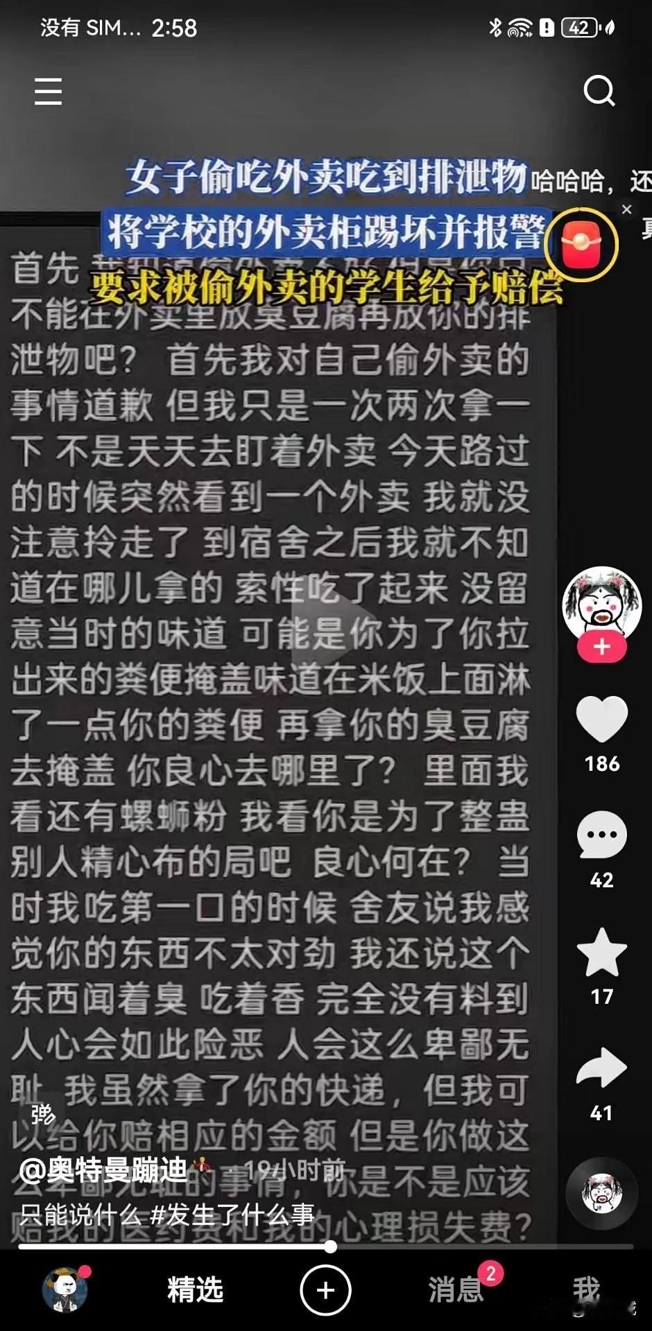 女子接二连三的偷外卖,居然偷吃到了外卖里面的排泄物,气愤之下将学校的外卖柜踢坏并报警,还要求被偷的那个学生给她赔偿。 见过不要脸的,从来没见过这么不要脸的,这究竟是父母从小没有教育好?还是这女子天生骨子里就是个坏种,她理直气壮的多次偷其他学生的外卖,被偷的这个学生也是实在没办法了,她灵机一动脑洞大开点了一份螺蛳粉在里面加入了排泄物,这女子偷去吃的时候被同宿舍的人说她这味道有点不对,女子也没有在乎这个,于是她就继续吃了起来,她在吃的过程中居然发现了屎,恼羞成怒的踢坏了外卖柜,并且报警要求那个学生给她赔偿。 这自作自受的行为真是活该,明明是偷人家的东西,被自己说成是拿,这样的人活该吃屎,没揍她就是轻的,还给她赔偿,让她好好长长记性偷别人的东西到底对吗?