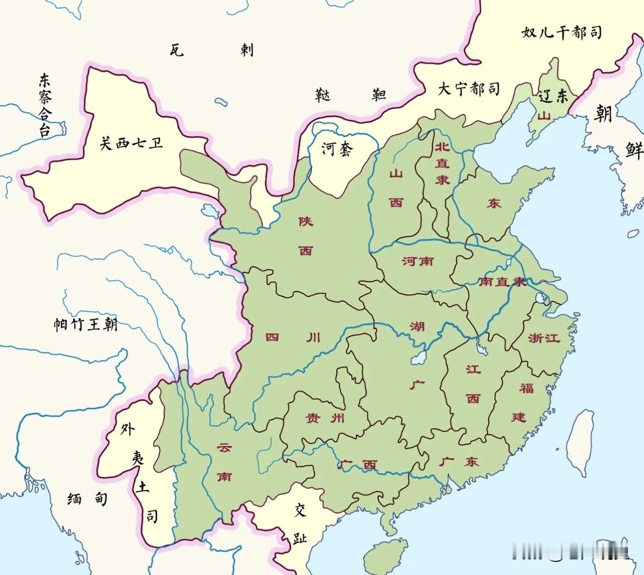 图一明朝最大疆域版图及周边国家势力 图二明朝万历1582年疆域版图及放弃领土 历朝历代到了晚期,还能保持两京十三省完整,确保长城边境线以内领土的并不常见,一方面明朝京师靠近北方防线,明朝皇帝又有“天子守国门、君王守社稷”的血勇之气;另一方面明朝军队战斗力强,尤其是九边军镇,就算到了明朝晚期依然保持着很强的战斗力,比如万历年间打赢了三大征。 历史地图 明朝