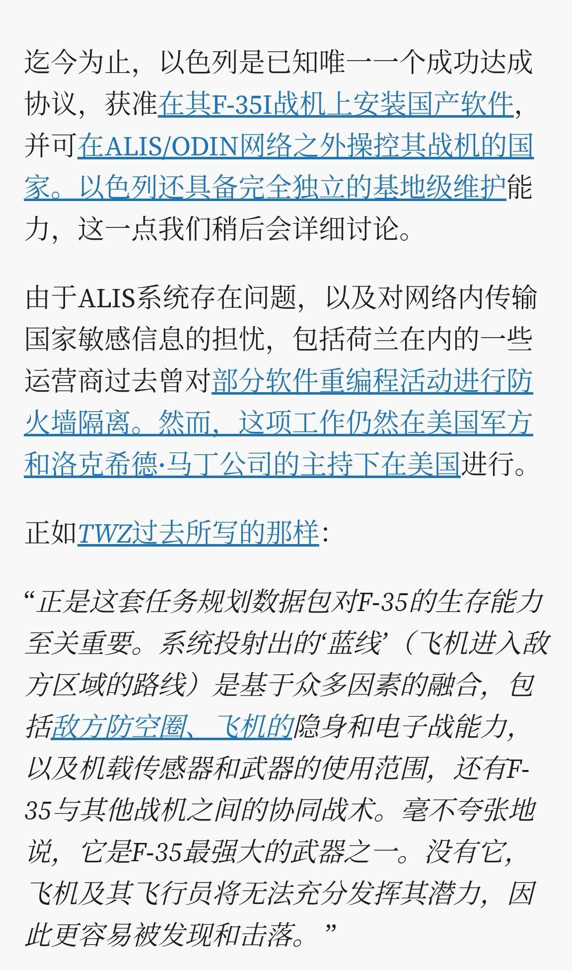 荷兰国防部长说,如果万不得已,可以破解F35的航电软件,像IPHONE一样“越狱”,以解除美国的控制。TWZ也证实,以色列的F35I战斗机是唯一一个安装自己的国产航电软件,并且拥有全套维护升级系统,不受美国人制约操控的F35战斗机,只能说爹就是爹。