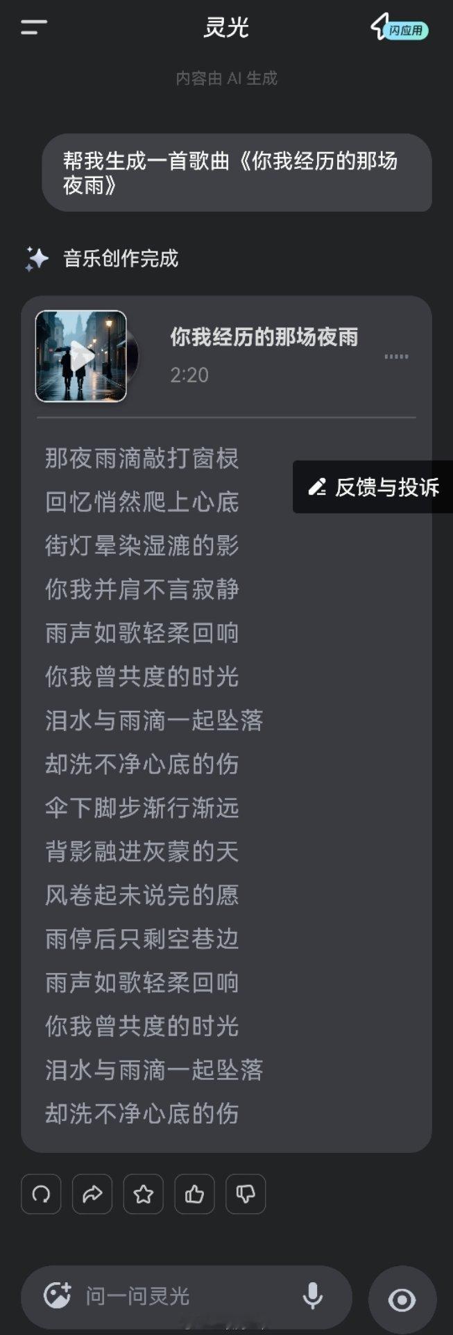 你我经历的一刻菲姐唱完,我来接棒哈哈 刚用灵光App生成一首新歌《你我经历的那场夜雨》,你别说你还真别说。 以后请叫我音乐人我的马年抓马之旅