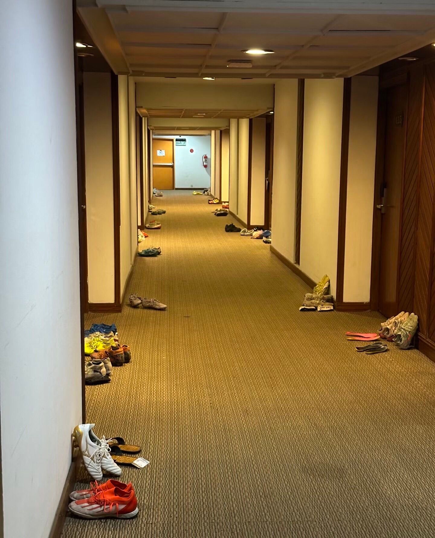 外出踢比赛的足球运动员们,晚上睡觉前,都是球鞋球袜放走廊里。