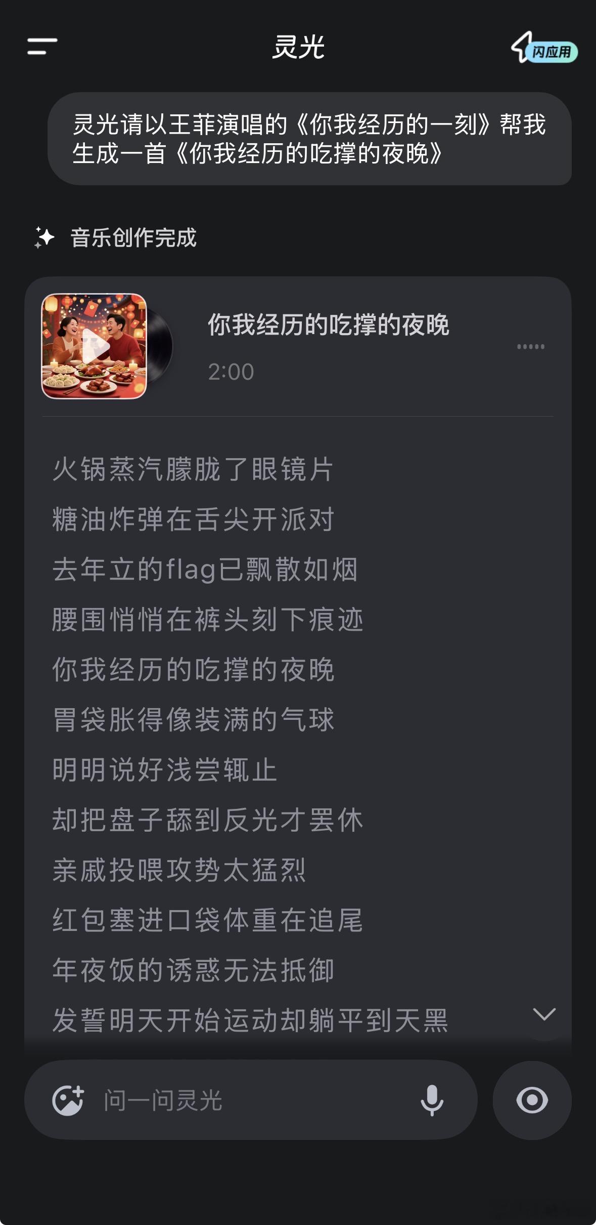 你我经历的一刻 行行行,让灵光App帮我生成歌曲《你我经历的吃撑的夜晚》,对标一下菲姐的金曲,这个除夕夜,我将以音乐人的身份重新跟大家相处。我的马年抓马之旅