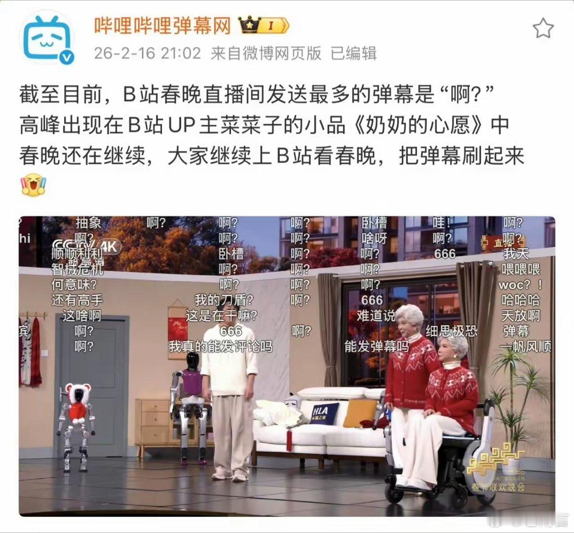 春晚直播间发送最多的弹幕B站成春晚独家弹幕视频平台后,看春晚发弹幕成了好多年轻人的新乐趣。据说B站春晚弹幕字数最多是 “啊”,这太能理解了。当看到第一个小品的时候,大家完全没想到是什么类型的的小品,很多人来不及组织语言,直接一个“啊”字就表达出内心激动,让人猝不及防就被震撼。而且B站年轻用户多,大家表达情绪更直接,一个“啊”字简单又带感,还能和其他观众共鸣。这种独特的观春晚方式