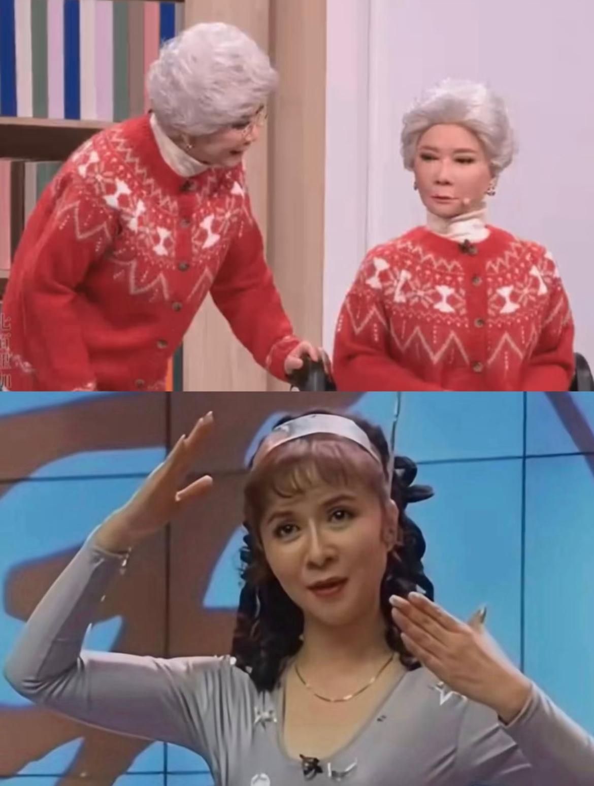 其实蔡明确实是机器人祖师奶,这个小品如果想最后推出机器人,外观要是致敬一下当年,效果应该会更好。 都机器人了,做个年轻的多好,这真人还站着,假机器人还被推轮椅片[捂脸] 甚至也不用完全一样,可以改一下造型换上头上的天线,或者相同的发型,或者可以推出来的时候换成当年的动作,都能让观众想起当年的经典。 当然了,前面的奶奶就是这个机器人,按我说的,可能设定就对不上了,但就算逻辑不合理大家也不会觉得不合理了,或者说不会去深究,也会原谅前面的不好笑