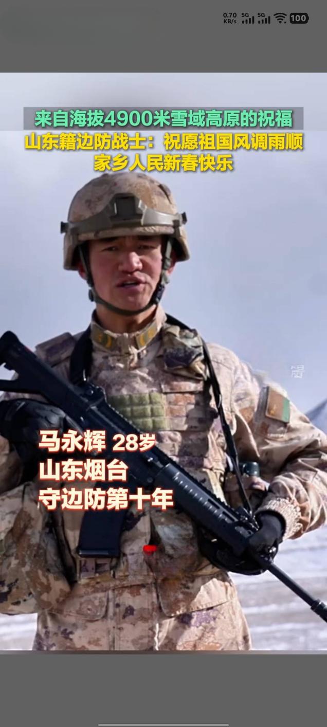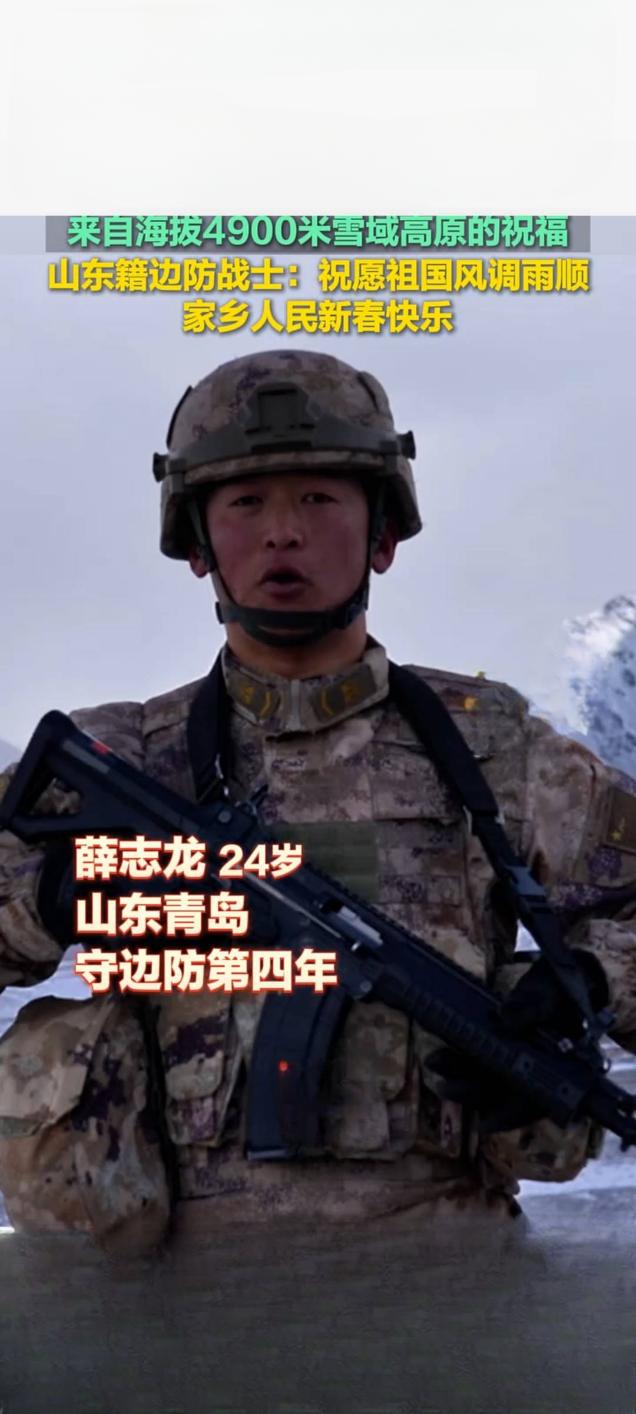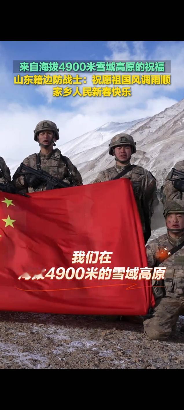 海拔4900米雪域高原传祝福 山东籍边防战士遥寄新春思念 新春佳节来临之际,一段来自海拔4900米雪域高原的新春祝福视频在快手平台走红,视频中山东籍边防战士们向祖国和家乡人民送上真挚祝愿,该作品已收获2.6万次播放,温暖了无数网友。 这片雪域高原长冬无夏,年均气温不足5℃,自然环境恶劣,边防战士们常年驻守在此,克服高原反应、气候严寒等重重困难,坚守在祖国的边防一线。万家团圆的时刻,他们选择以哨位为家,将对家人的思念藏于心底,用忠诚与坚守守护山河安宁。 视频里,战士们朴实的话语满含深情,真挚祝愿祖国风调雨顺、繁荣昌盛,家乡人民新春快乐、阖家幸福。简单的祝福,承载着边防军人的家国情怀,也彰显着齐鲁儿女的责任与担当。 网友纷纷为坚守边关的战士们点赞,感慨正是因为他们的默默奉献,才有了千家万户的平安团圆,这份来自雪域高原的祝福,也成为这个春节里最暖心的感动。致敬边关战士
