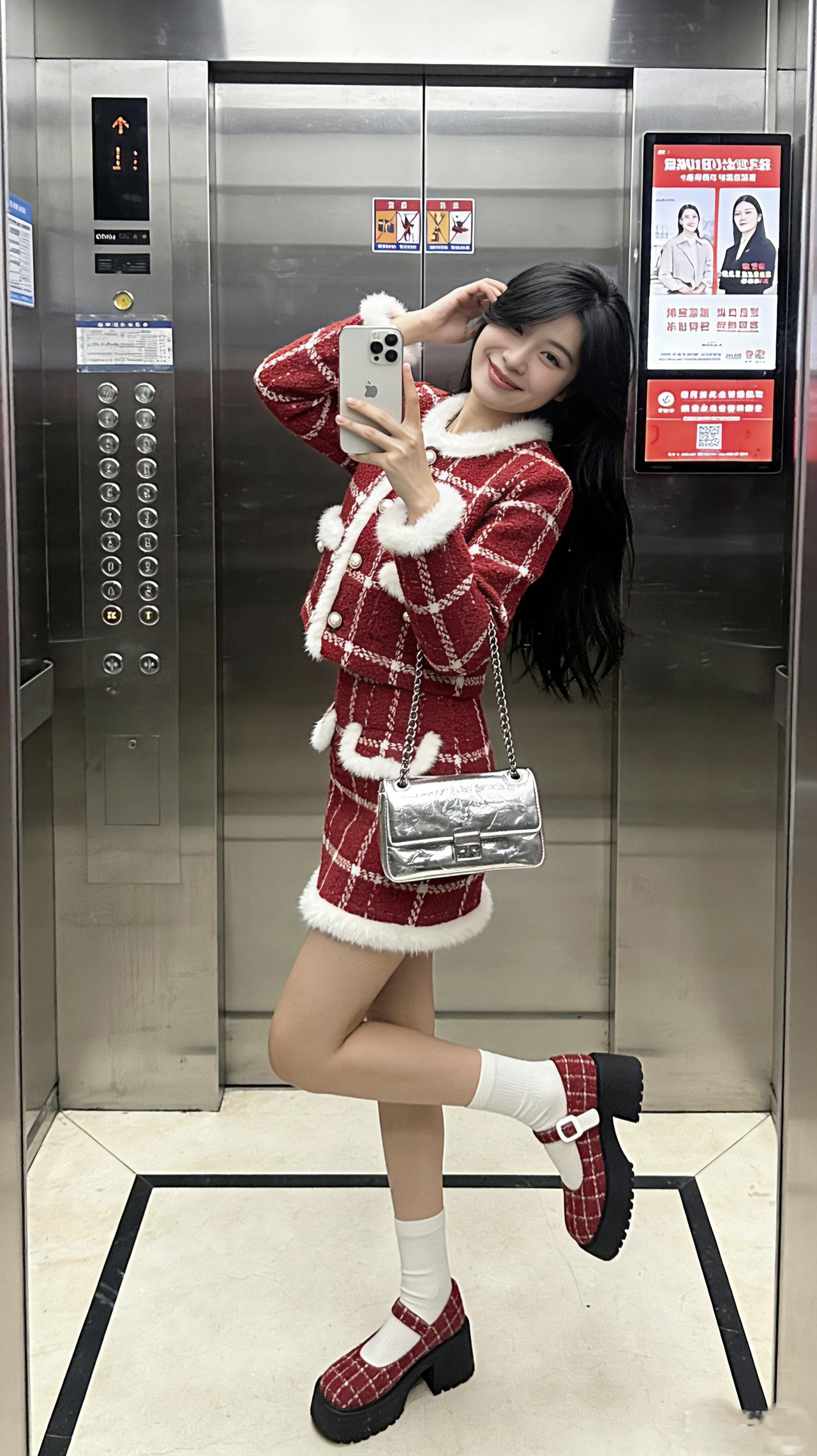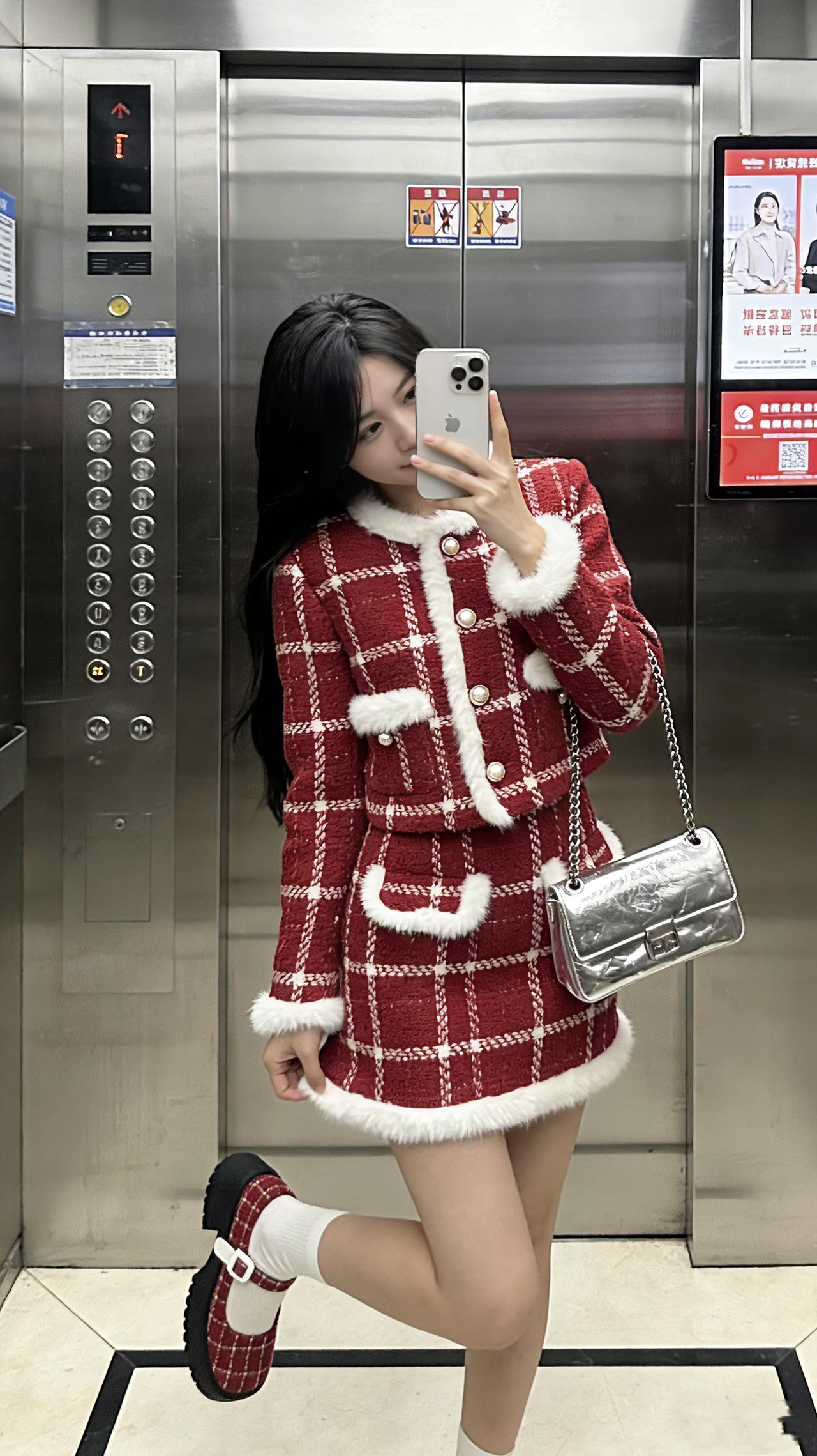 新年快乐 新年时髦穿搭 新年红红火火大吉大利 电梯拍照