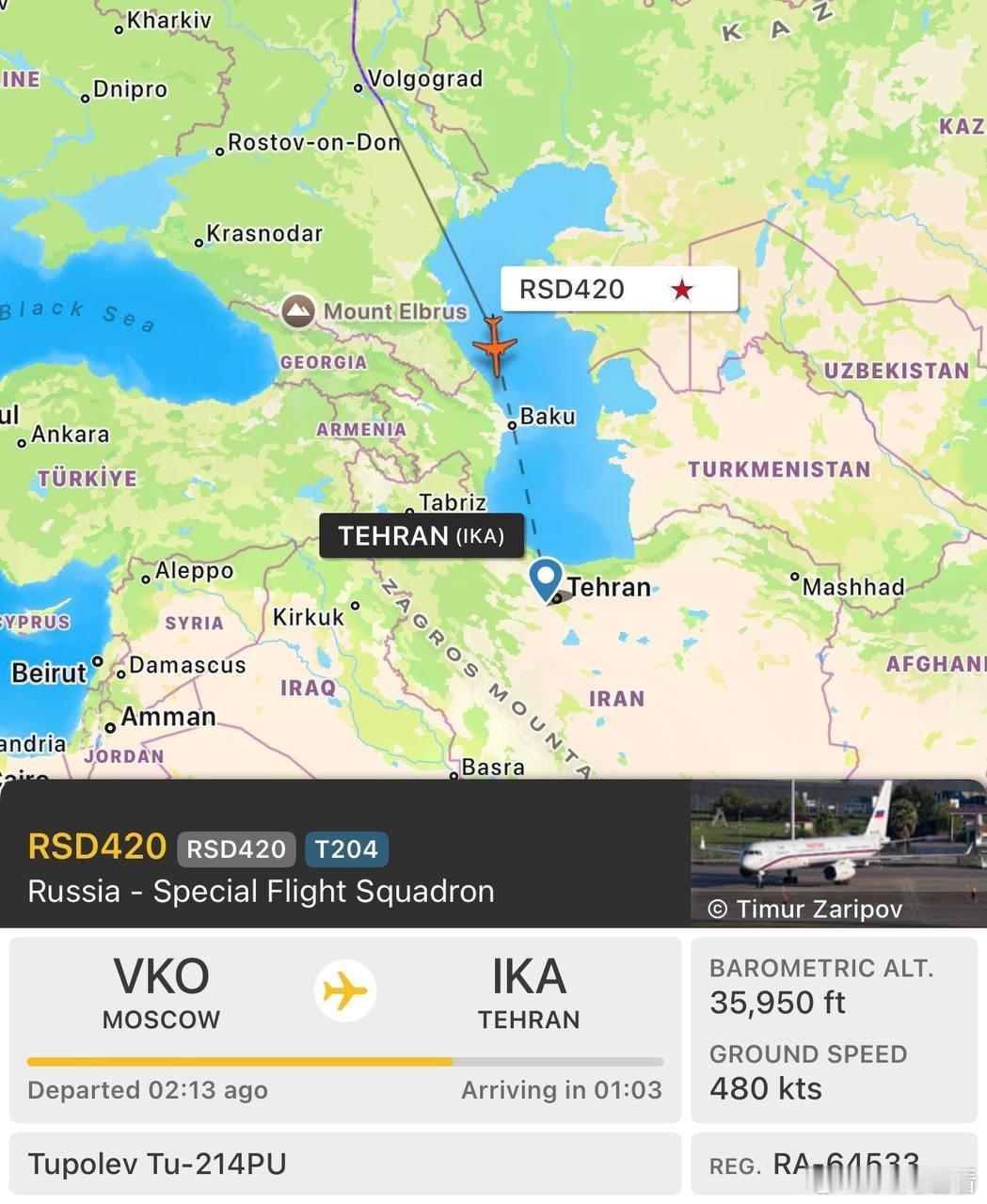 俄罗斯特种飞行中队的一架图波列夫 Tu-214PU 空中指挥所 RSD420 已从莫斯科起飞,前往伊朗首都德黑兰。该机曾用于运送俄罗斯政府高级官员。
